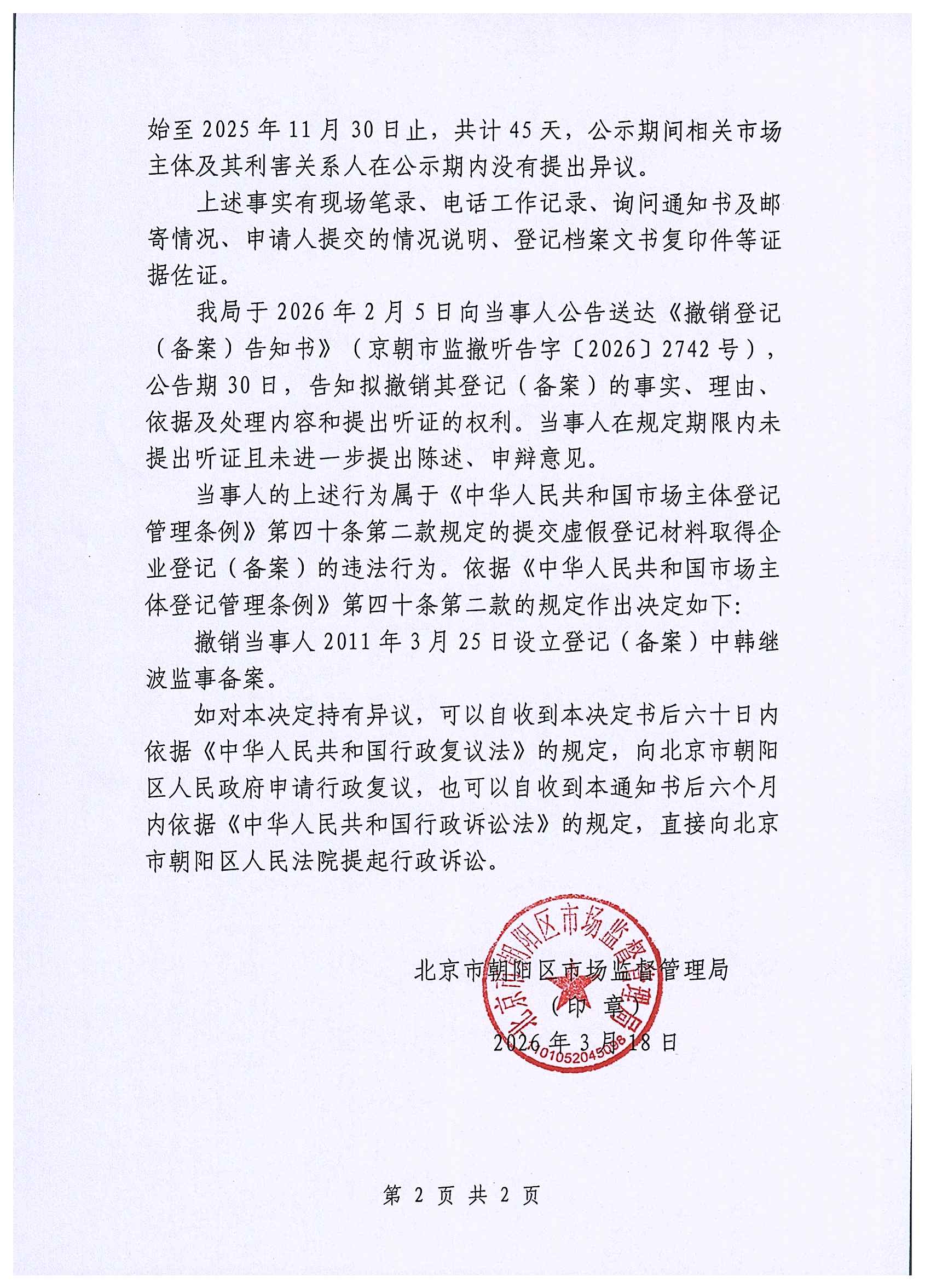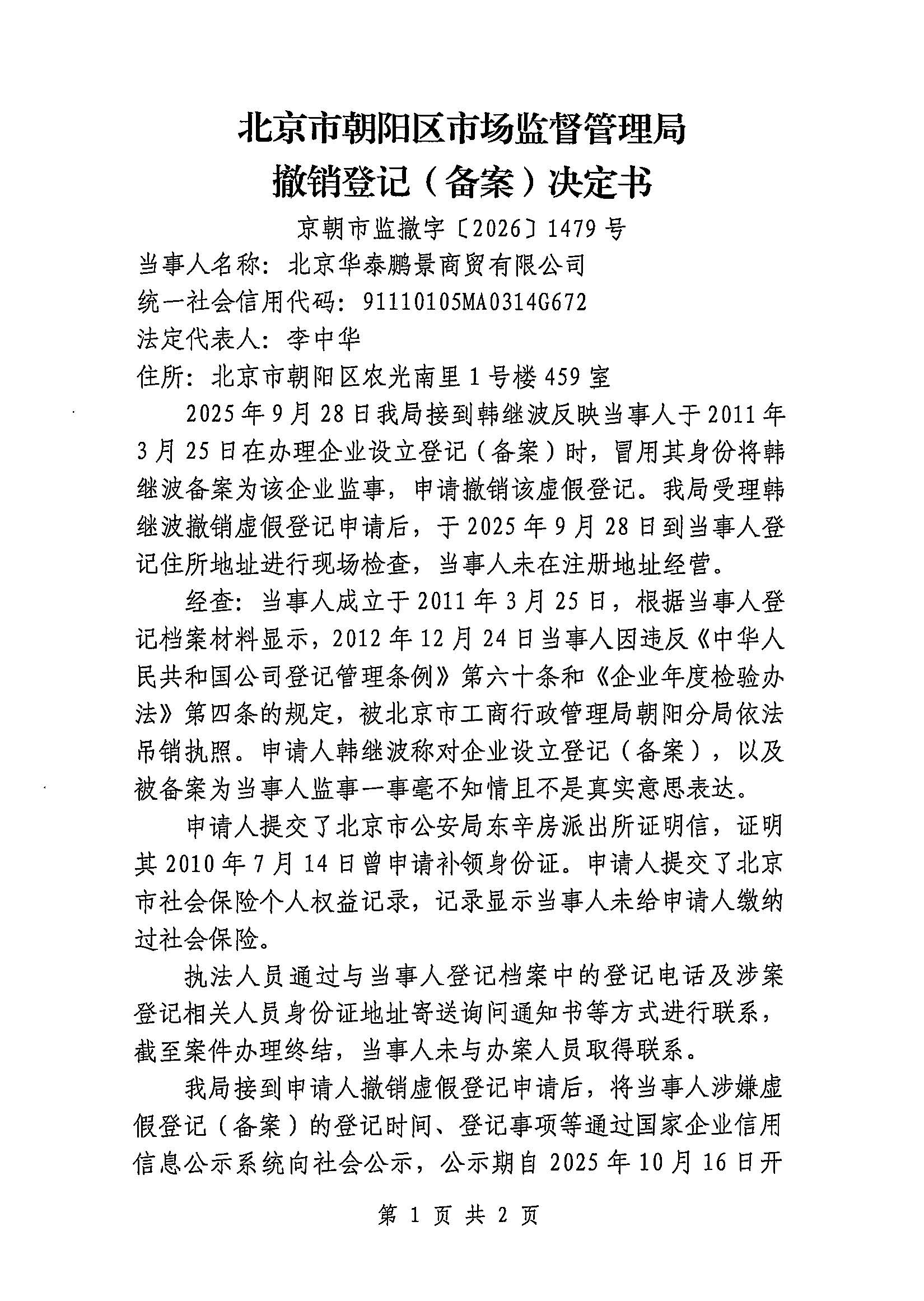 撤销北京华泰鹏景商贸有限公司登记(备案)决定书