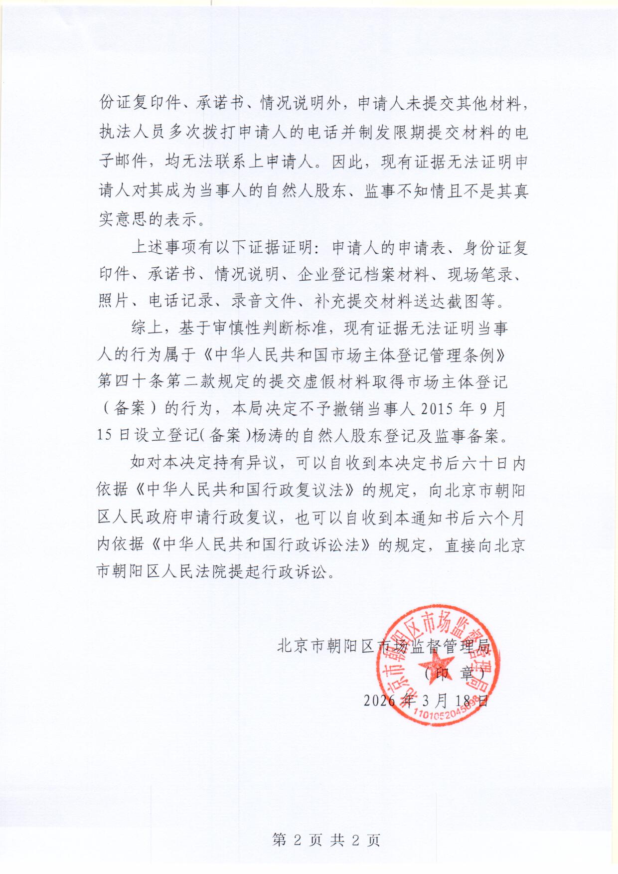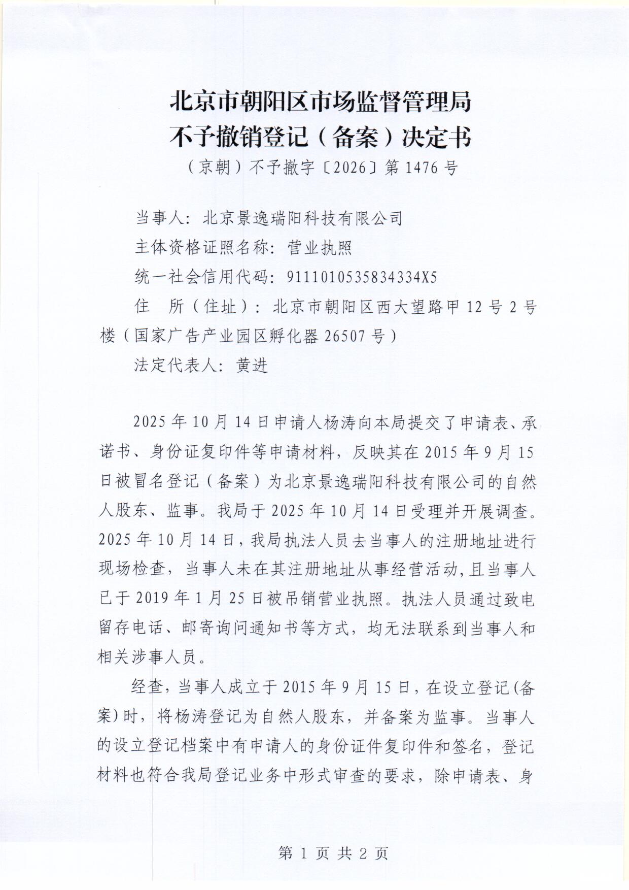 不予撤销北京景逸瑞阳科技有限公司登记(备案)决定书