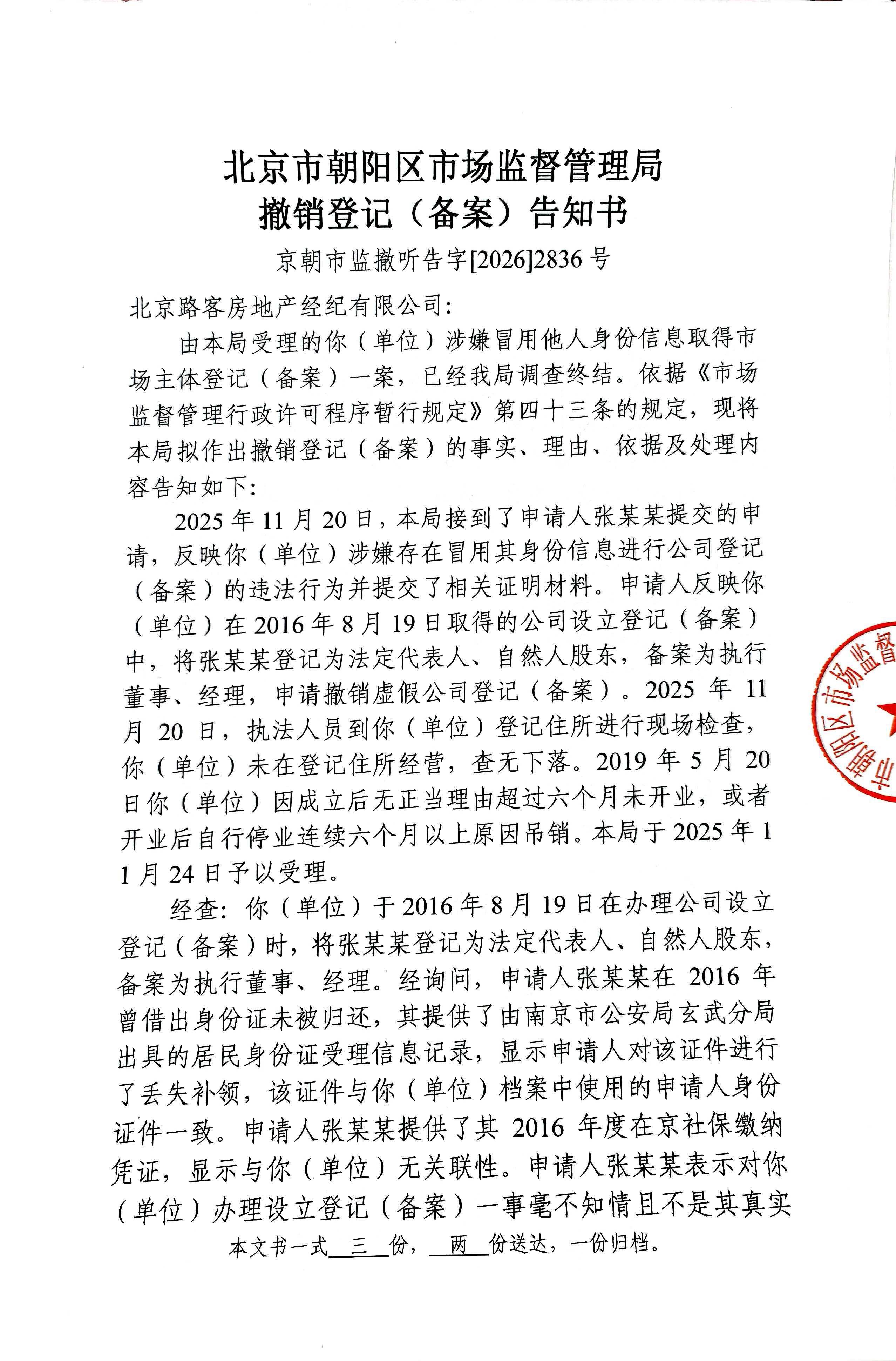 撤销北京路客房地产经纪有限公司登记(备案)告知书