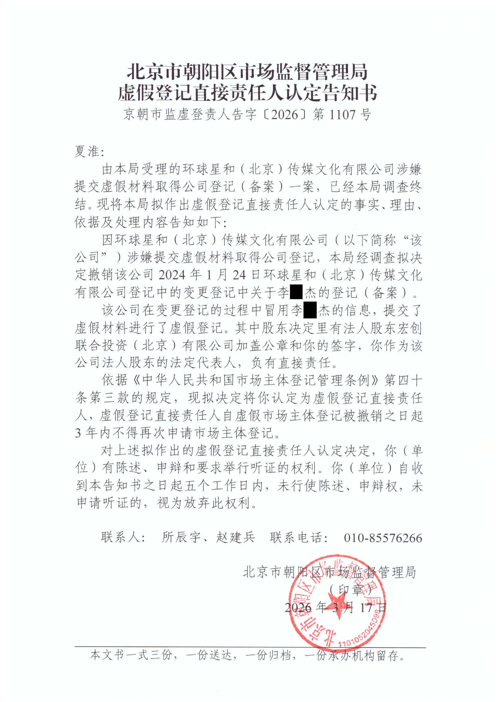 环球星和(北京)传媒文化有限公司虚假登记直接责任人认定告知书