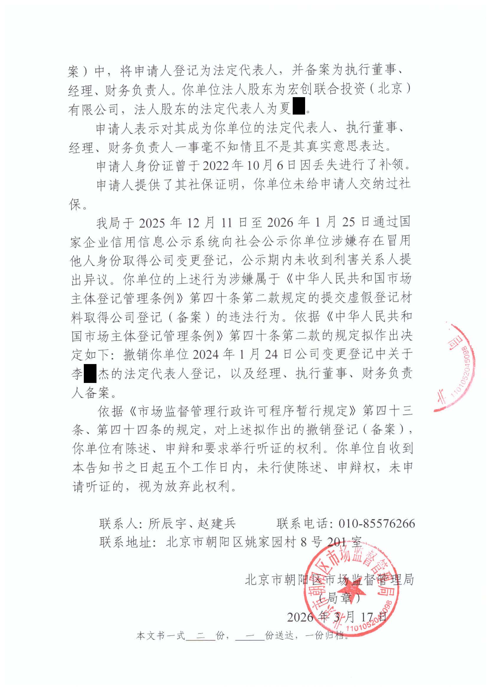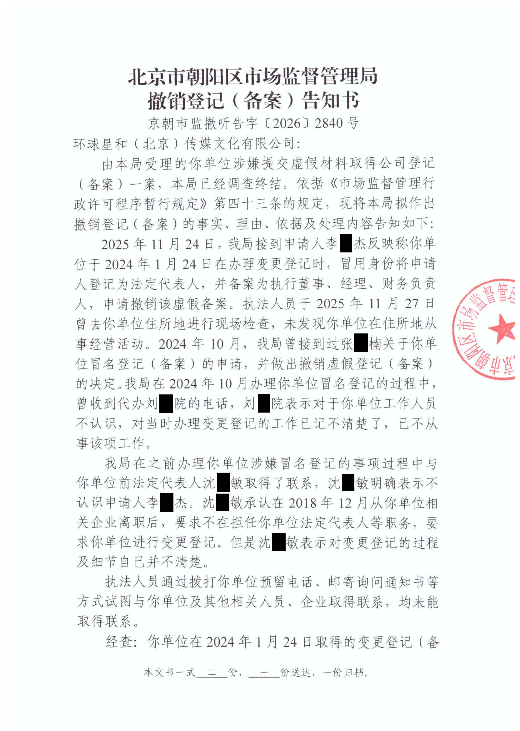撤销环球星和(北京)传媒文化有限公司登记(备案)告知书