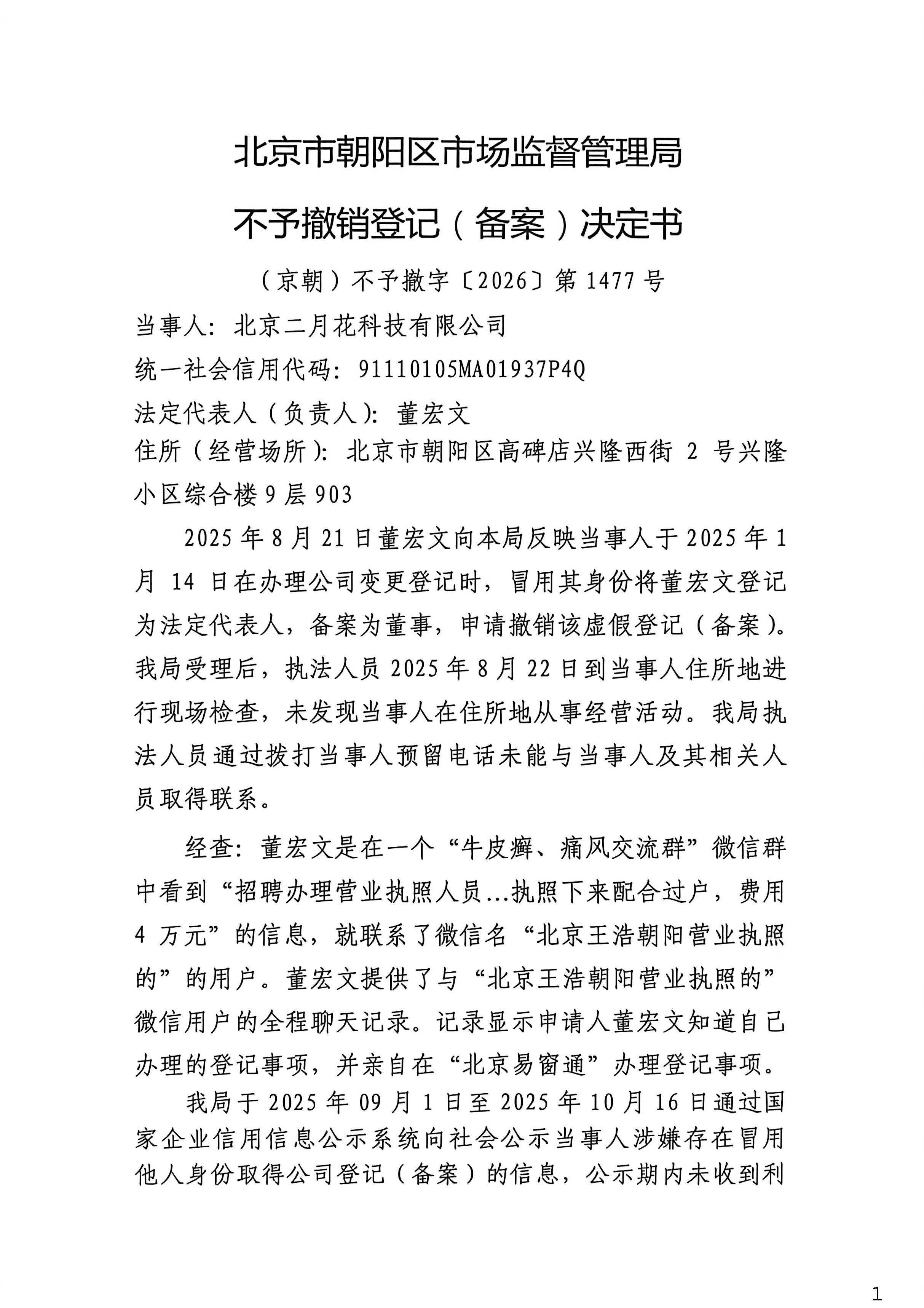 不予撤销北京二月花科技有限公司登记(备案)决定书