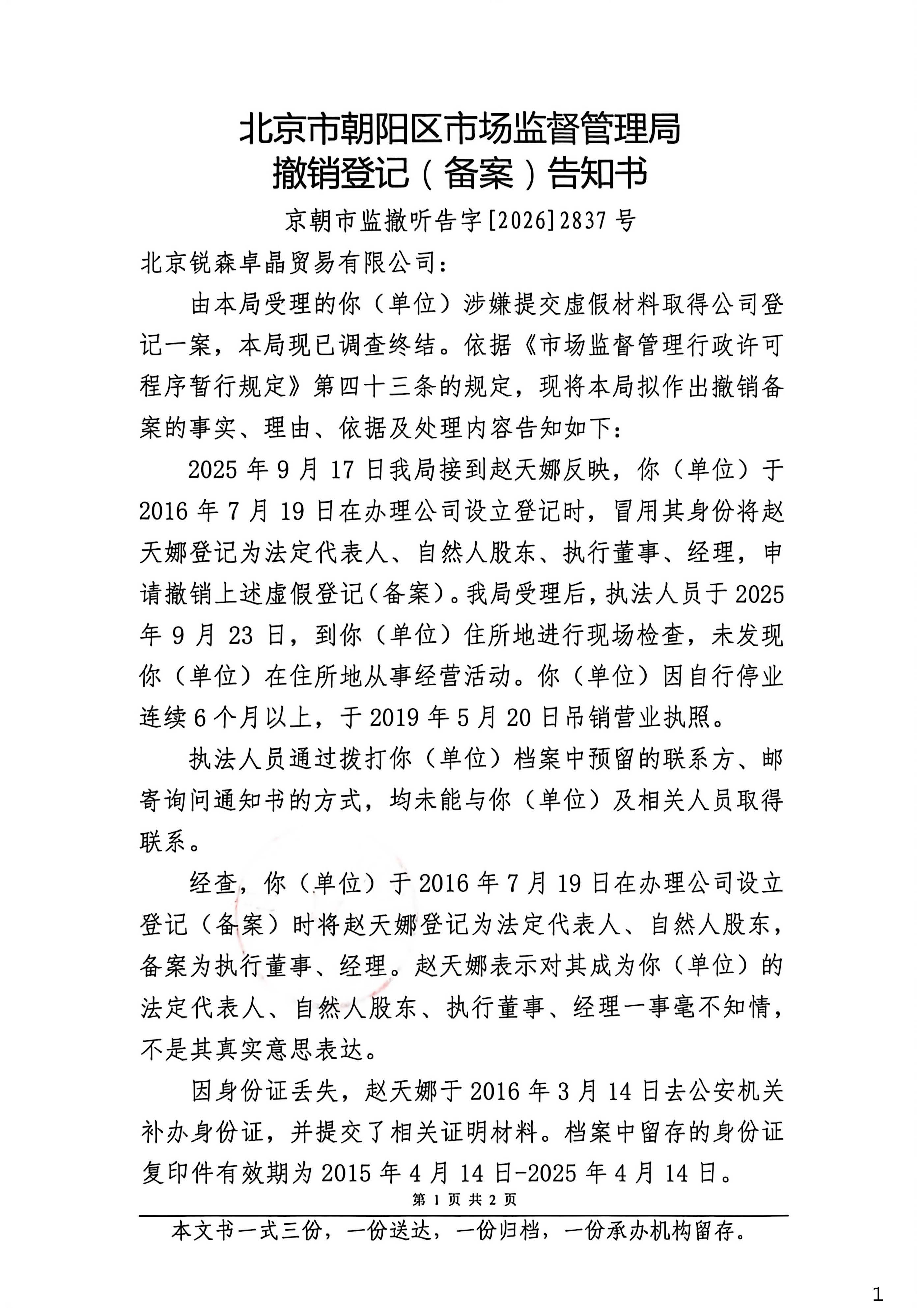 撤销北京锐森卓晶贸易有限公司登记(备案)告知书