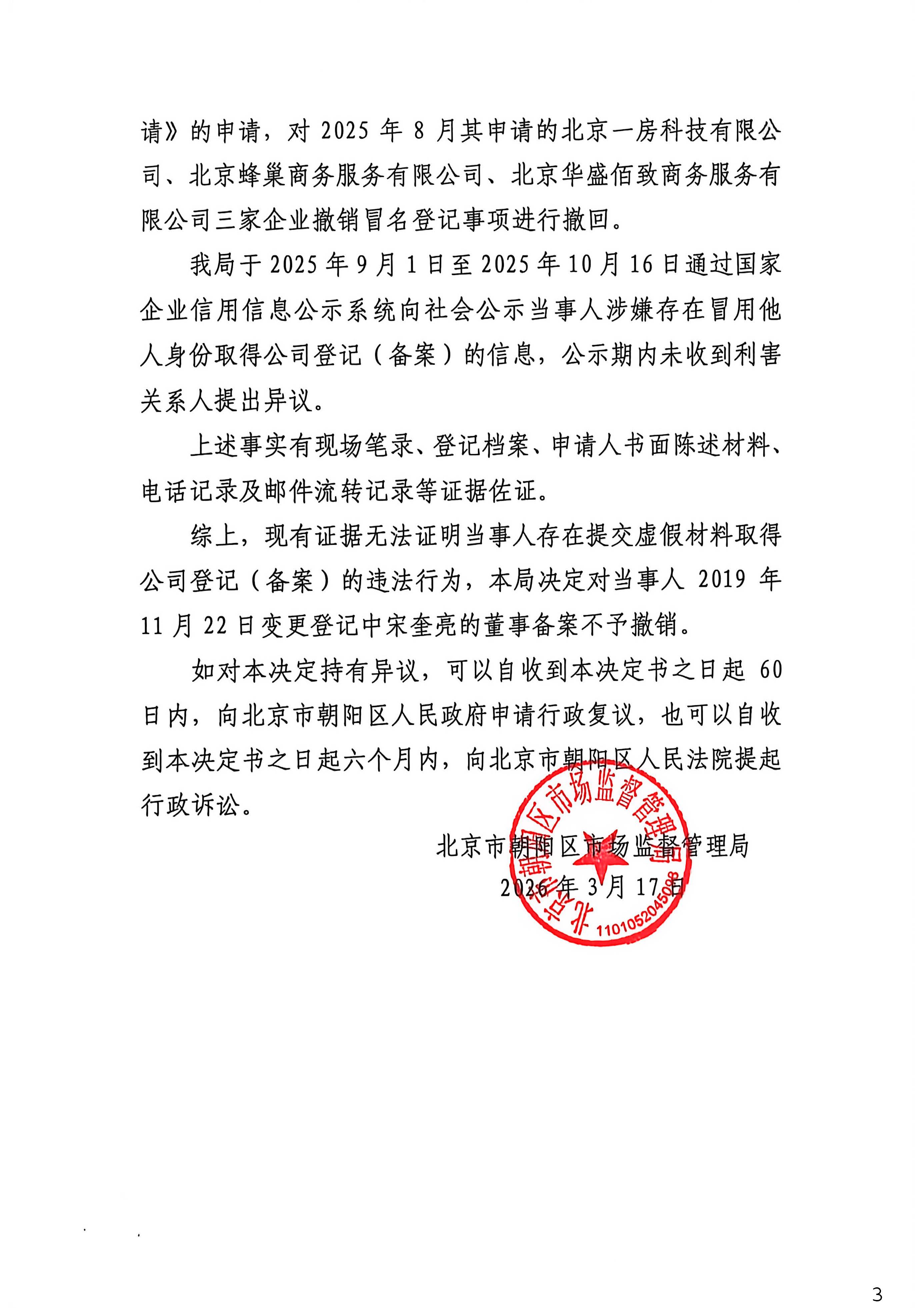 不予撤销北京一房科技有限公司登记(备案)决定书