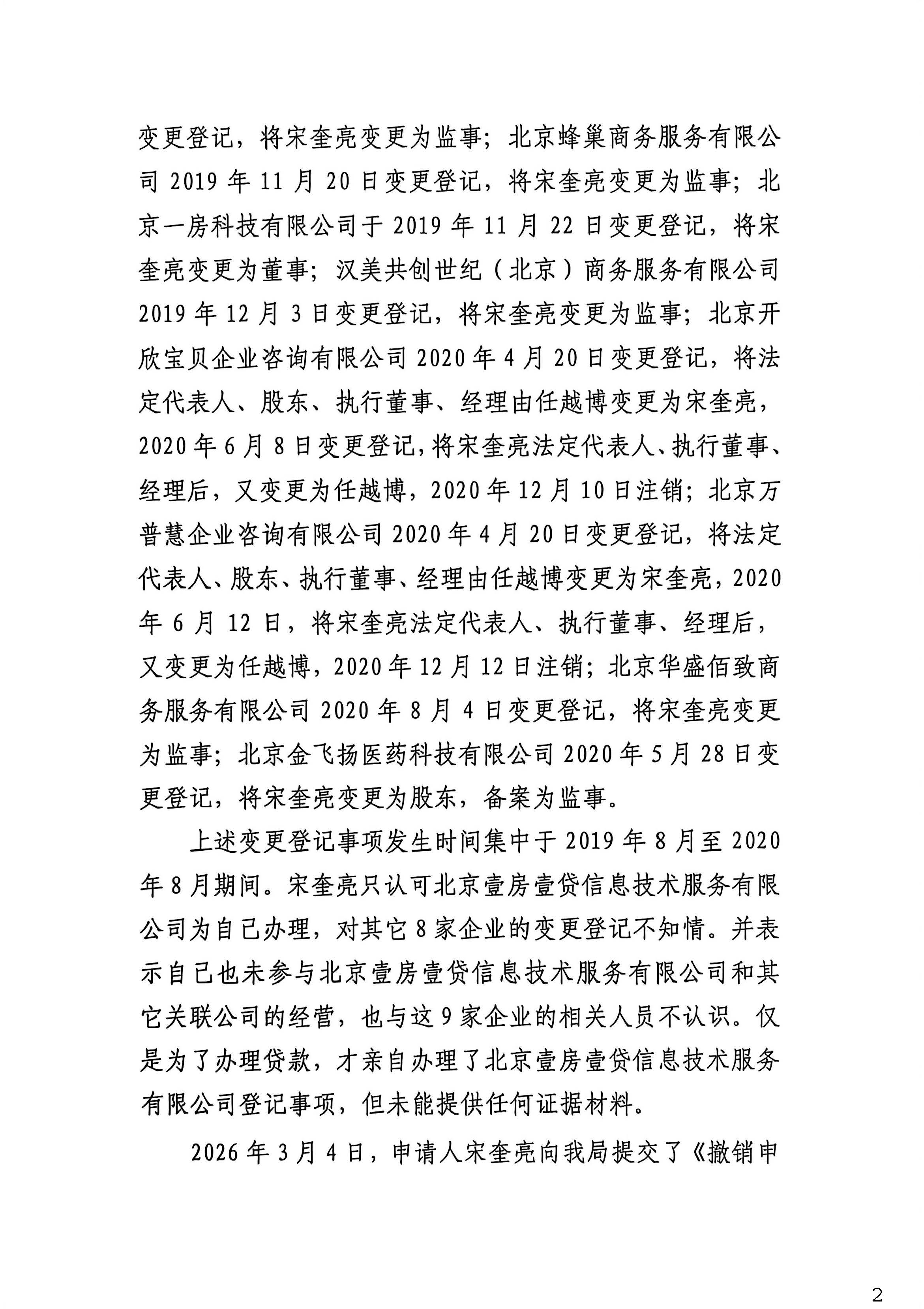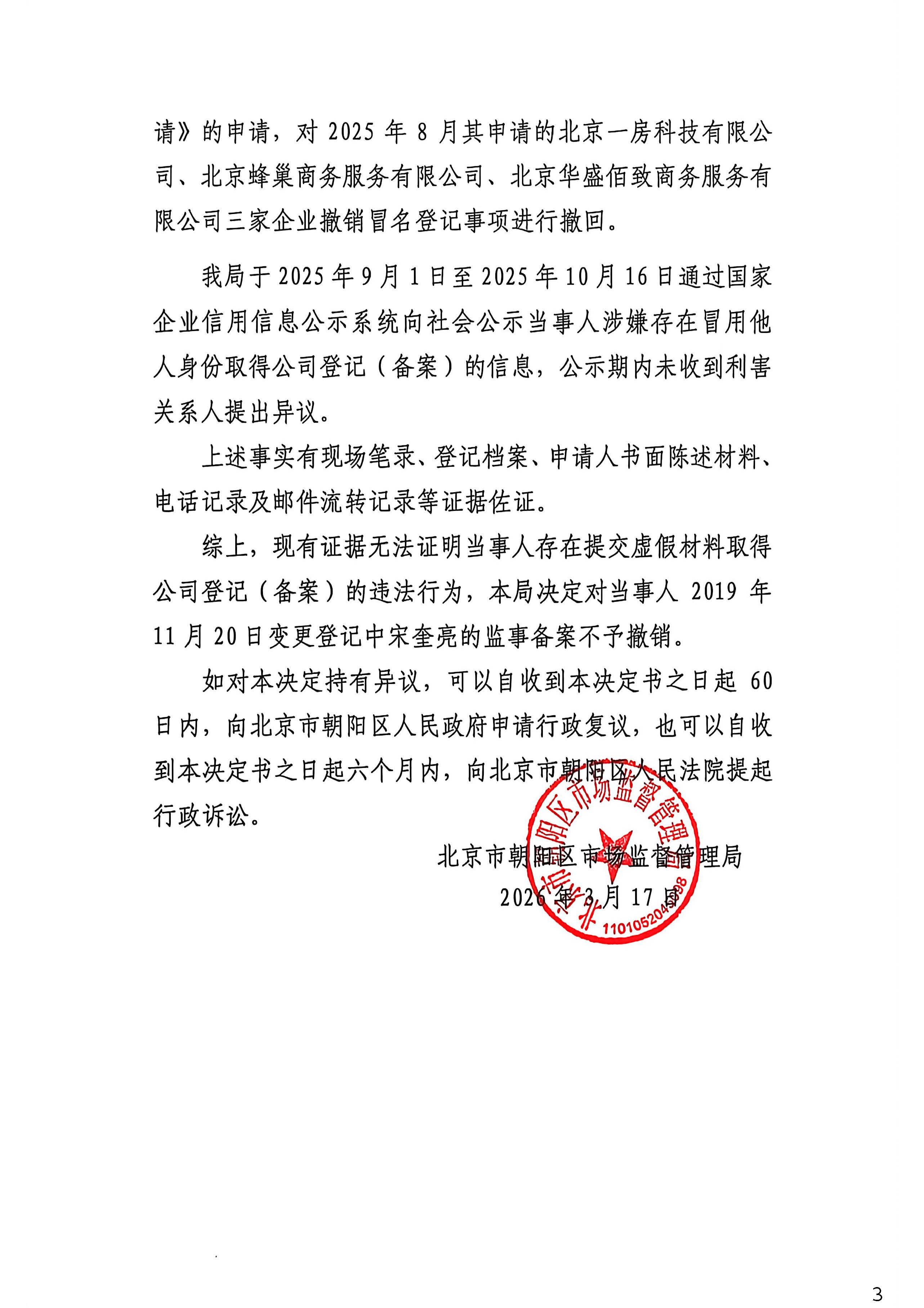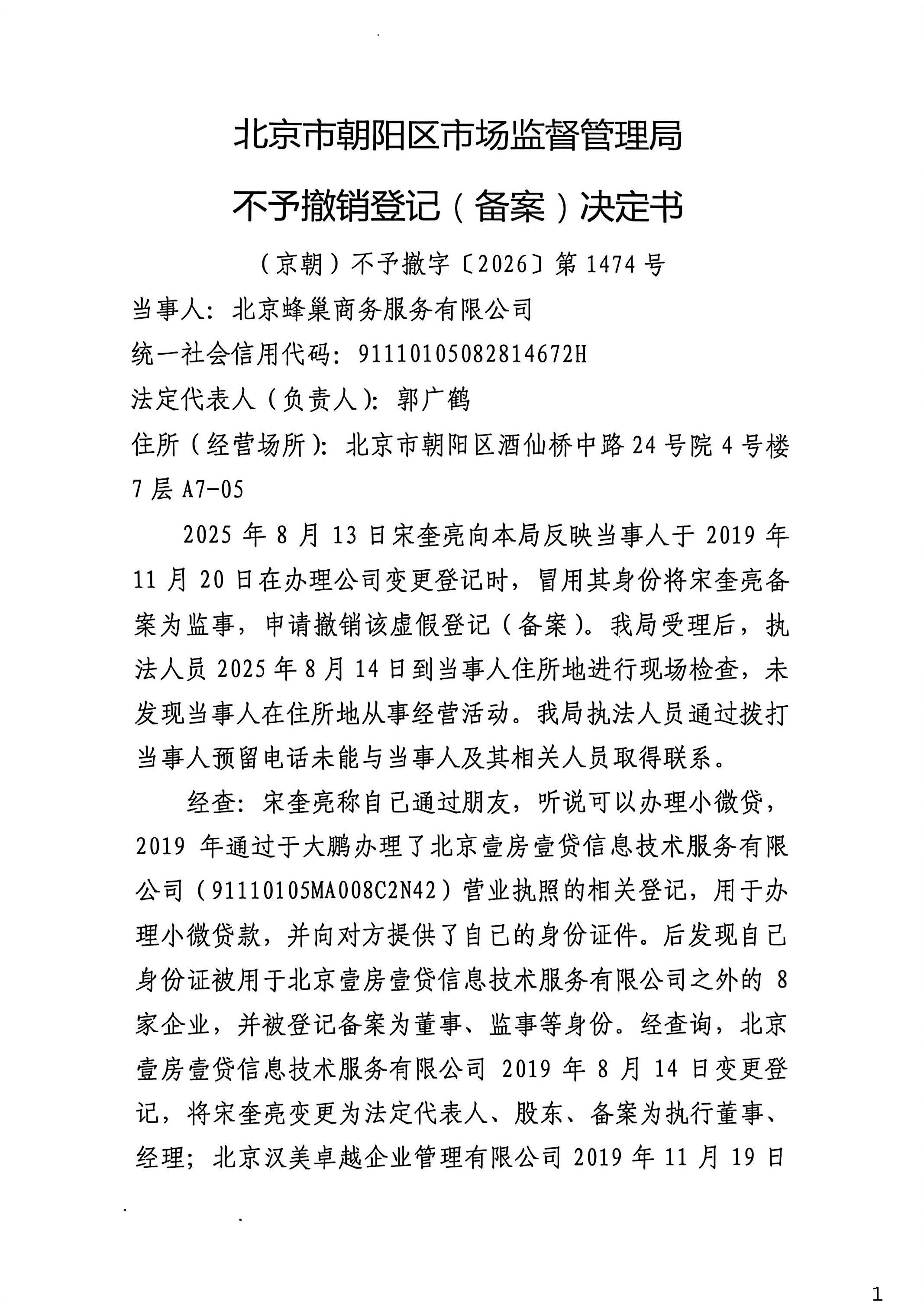 不予撤销北京蜂巢商务服务有限公司登记(备案)决定书