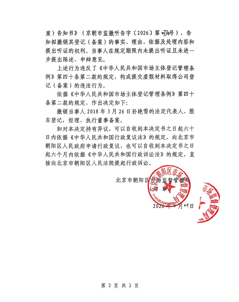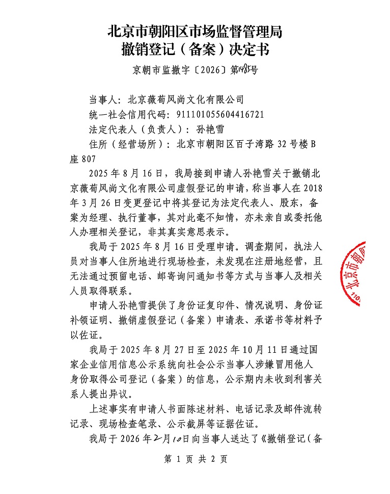 撤销北京薇荀风尚文化有限公司登记(备案)决定书