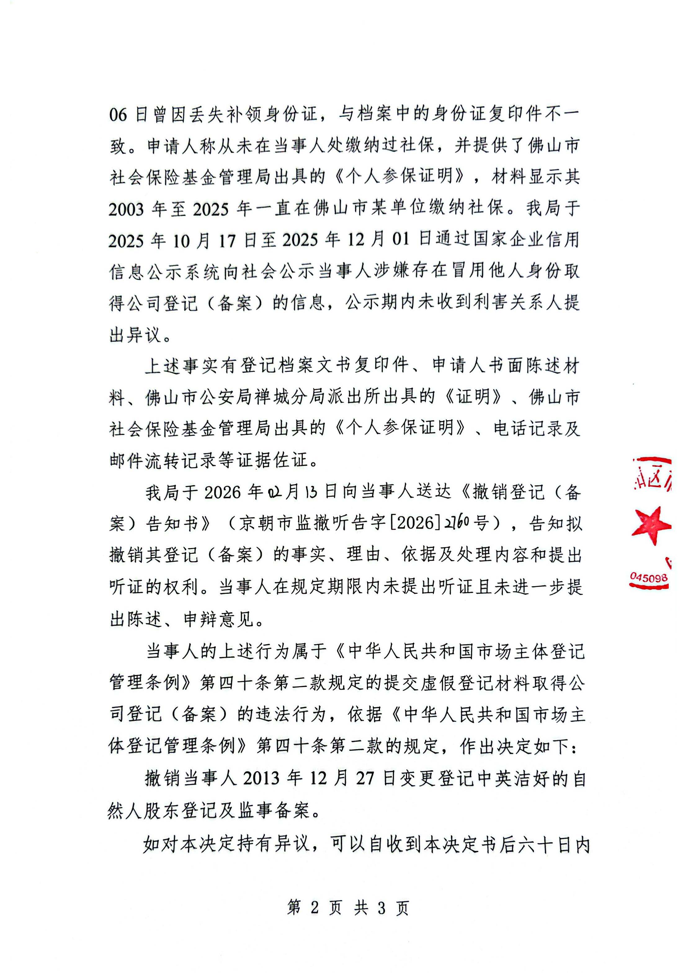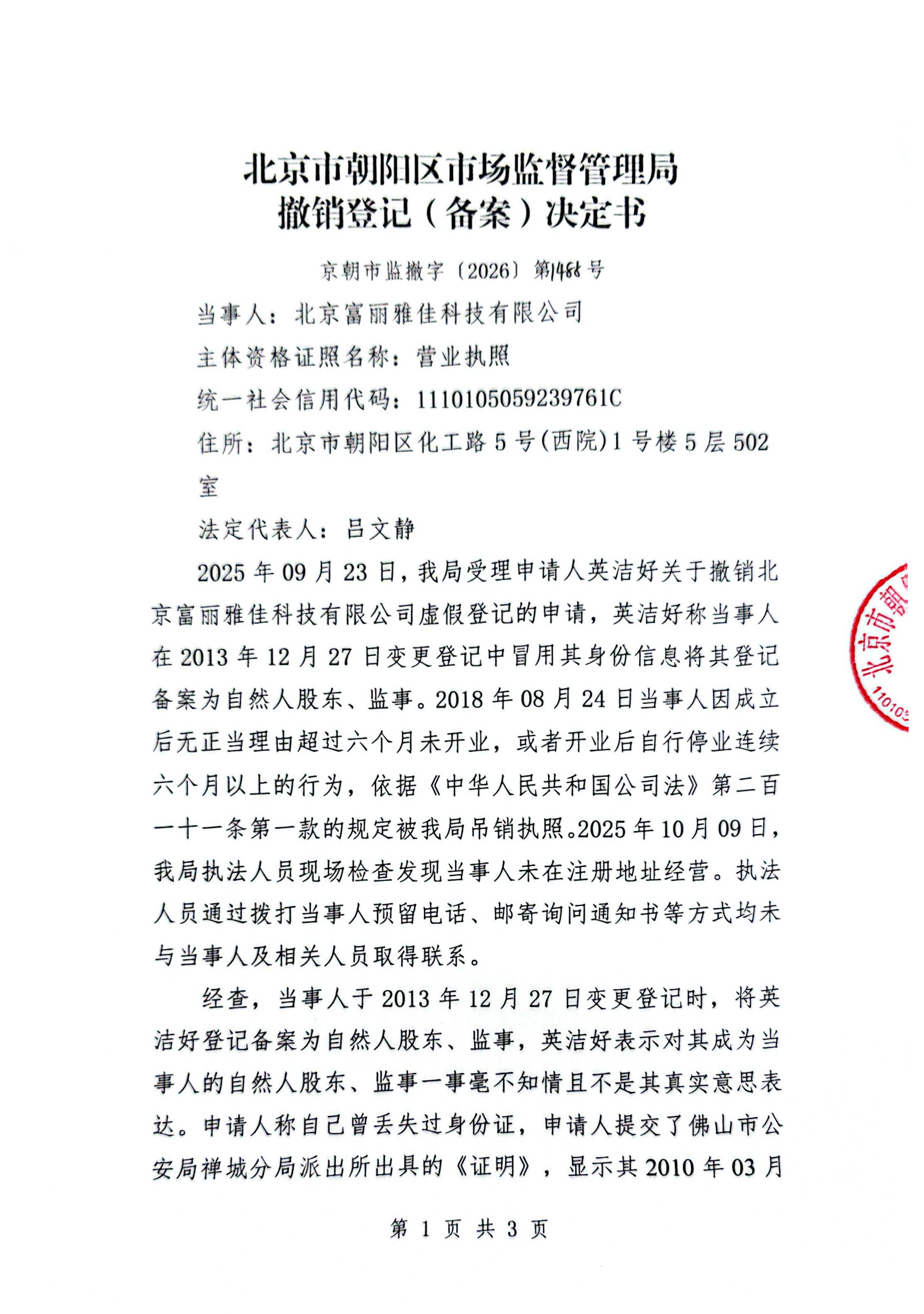 撤销北京富丽雅佳科技有限公司登记(备案)决定书