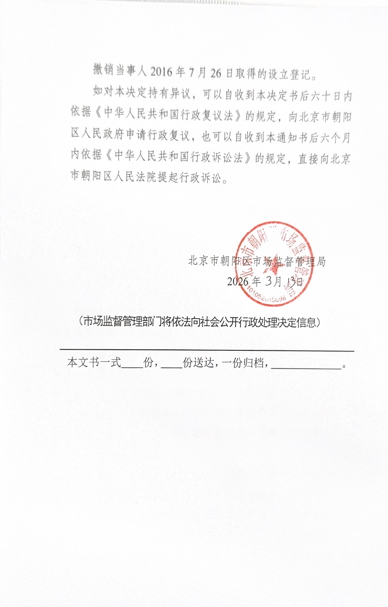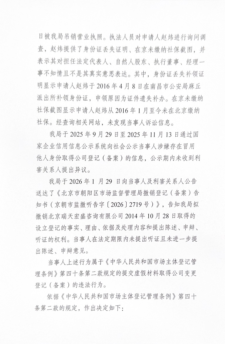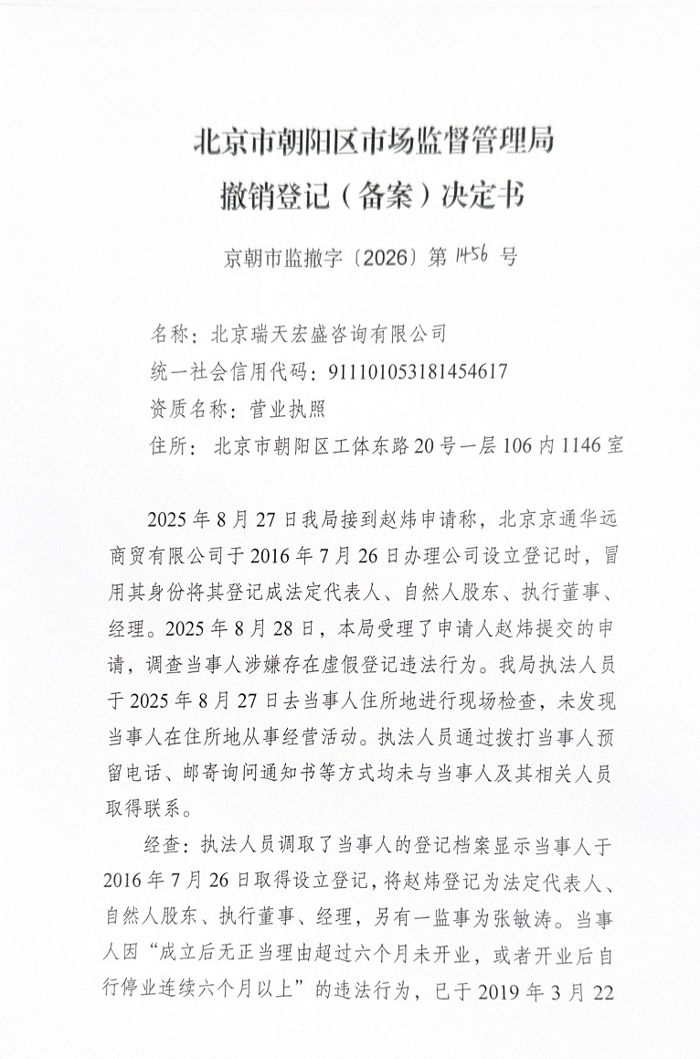 撤销北京瑞天宏盛咨询有限公司登记(备案)决定书