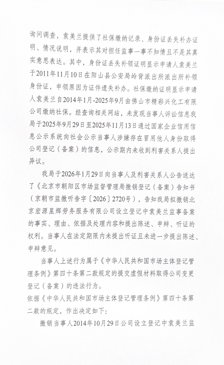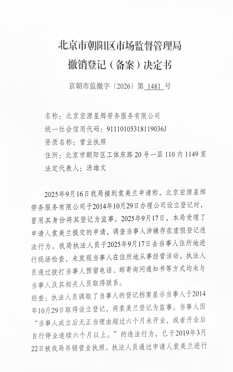 撤销北京宏源星辉劳务服务有限公司登记(备案)决定书