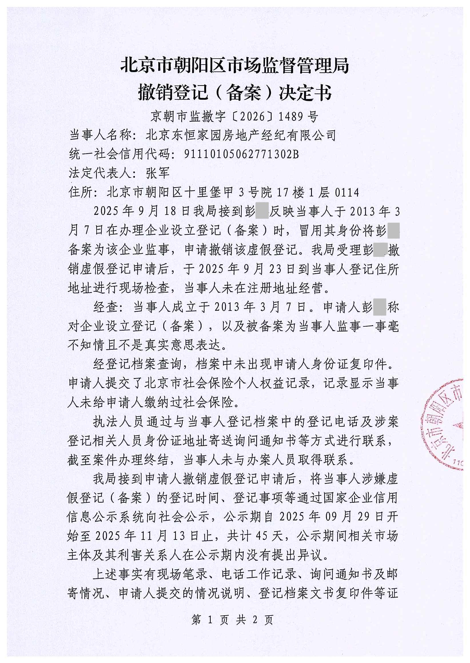 撤销北京东恒家园房地产经纪有限公司登记(备案)决定书