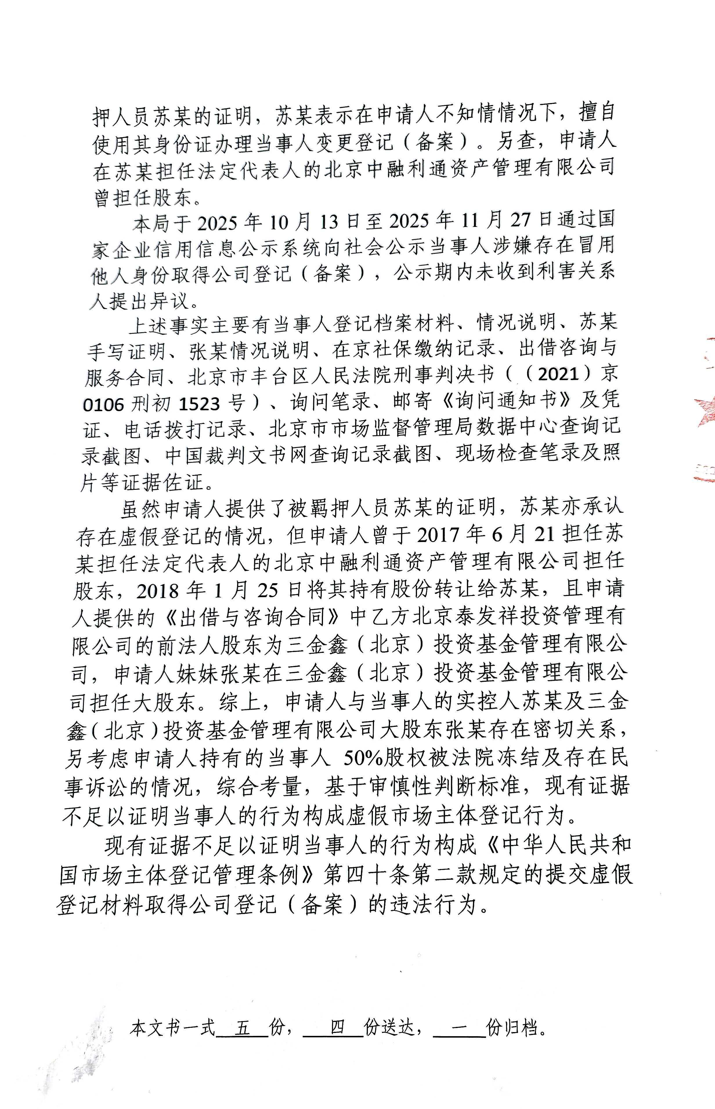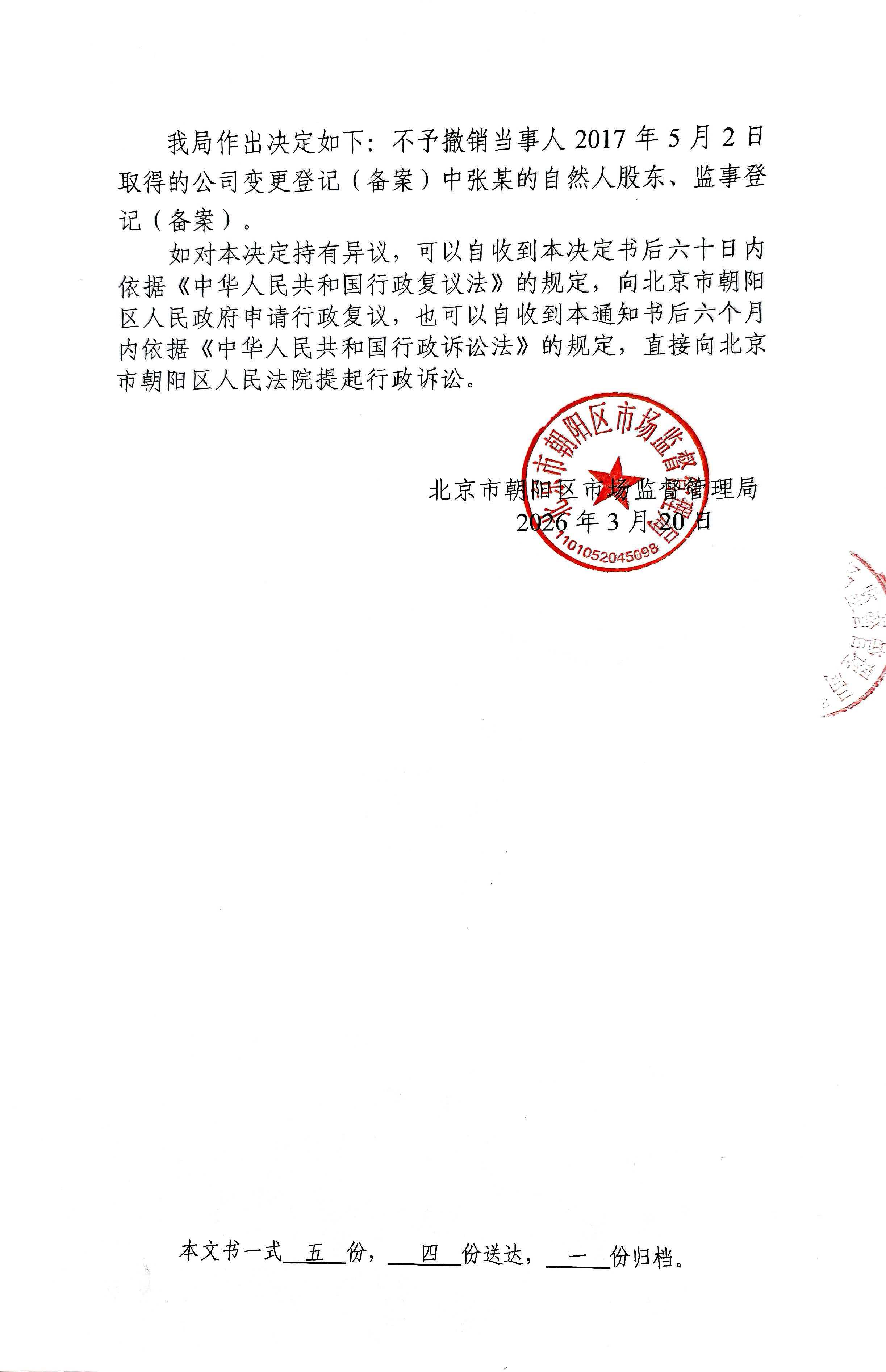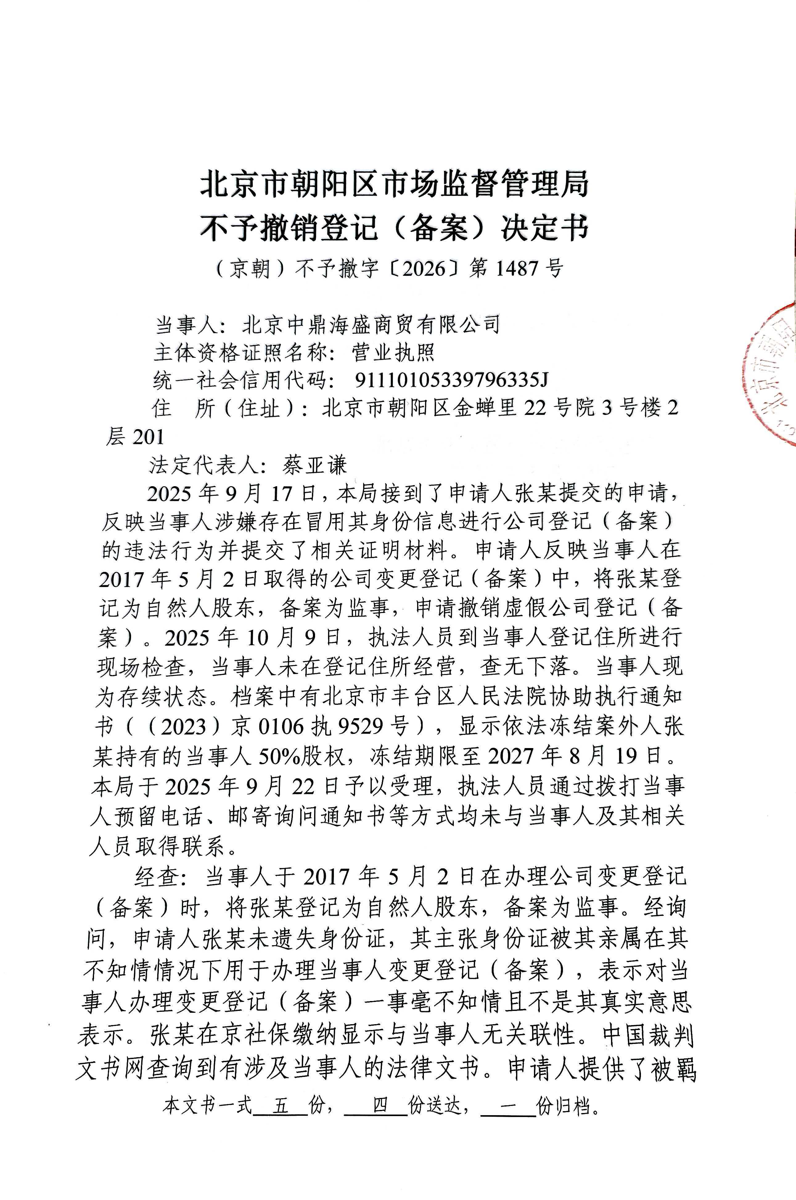 不予撤销北京中鼎海盛商贸有限公司登记(备案)决定书