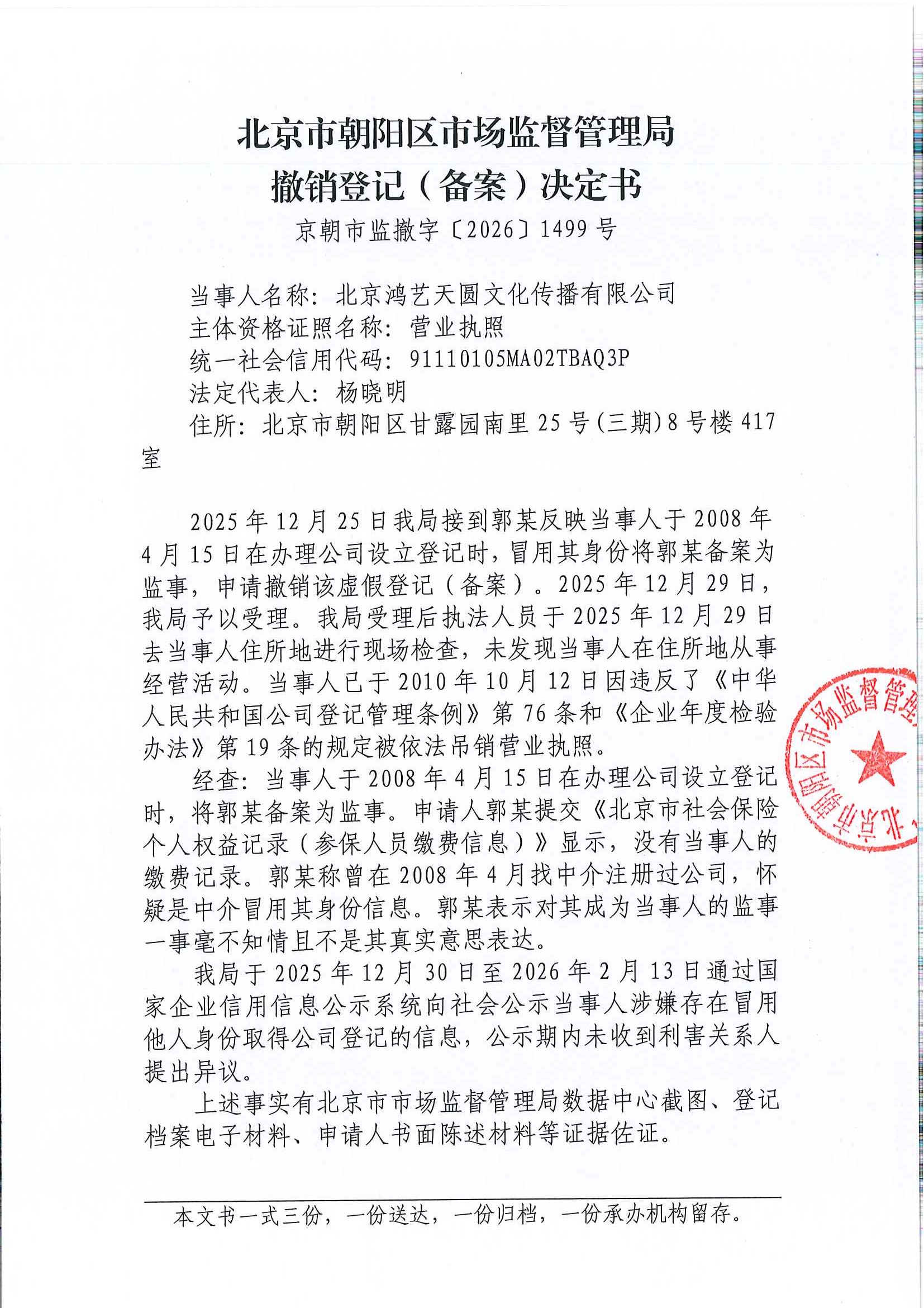 撤销北京鸿艺天圆文化传播有限公司登记(备案)决定书
