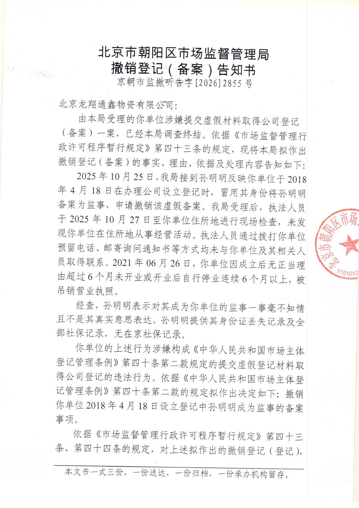 撤销北京龙翔通鑫物资有限公司登记(备案)告知书