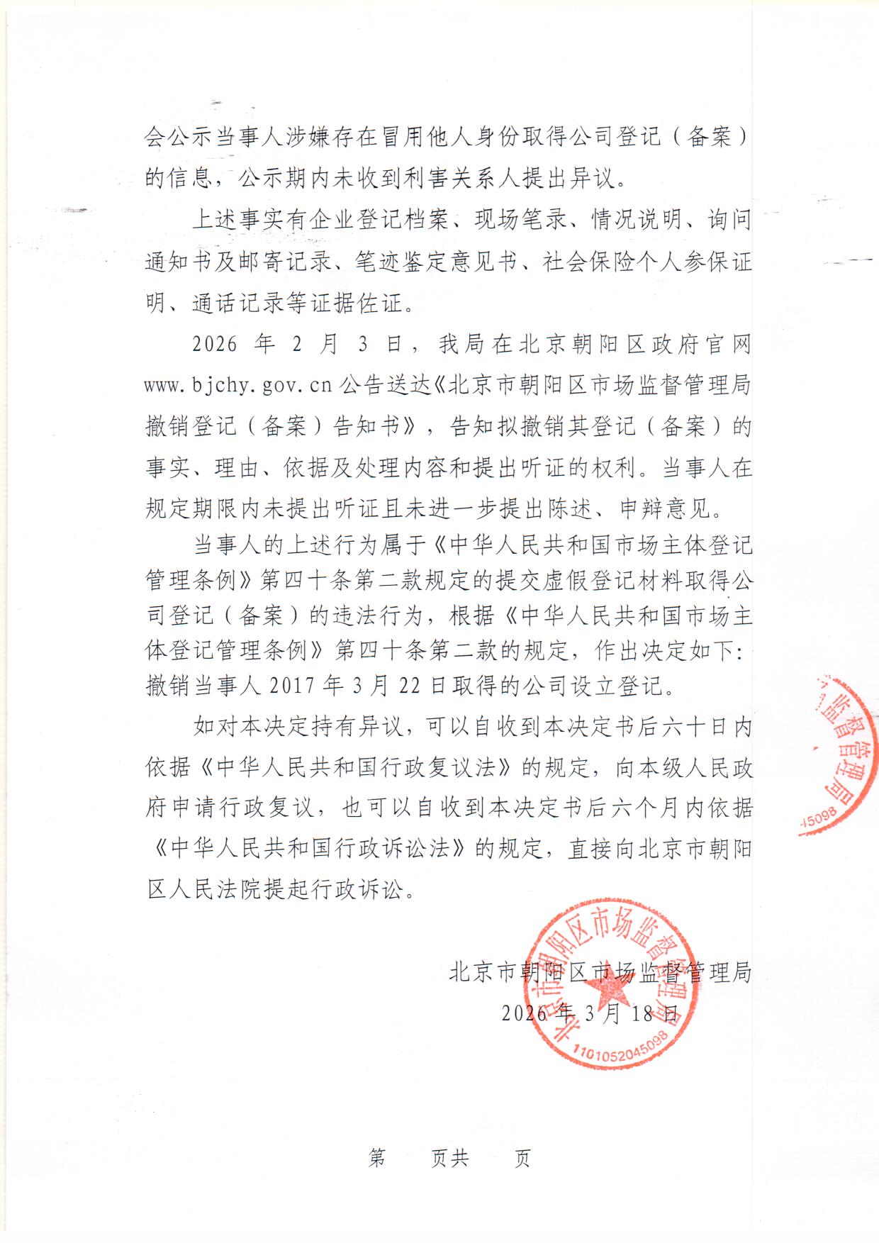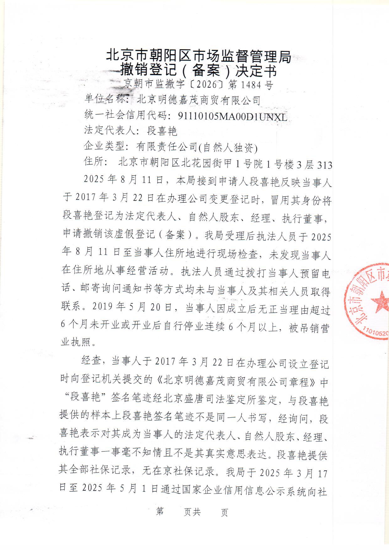 撤销北京明德嘉茂商贸有限公司登记(备案)决定书