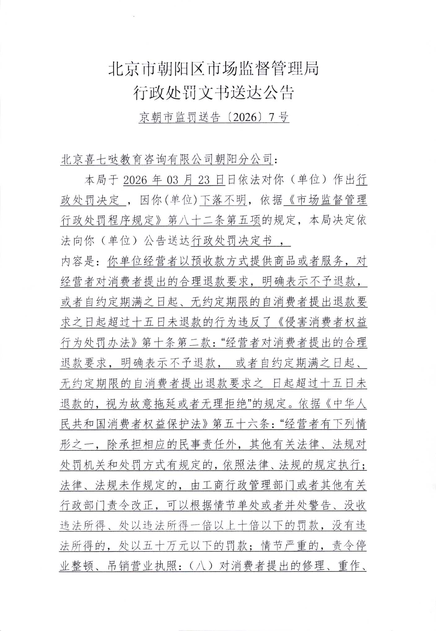 北京喜七哒教育咨询有限公司朝阳分公司行政处罚文书送达公告