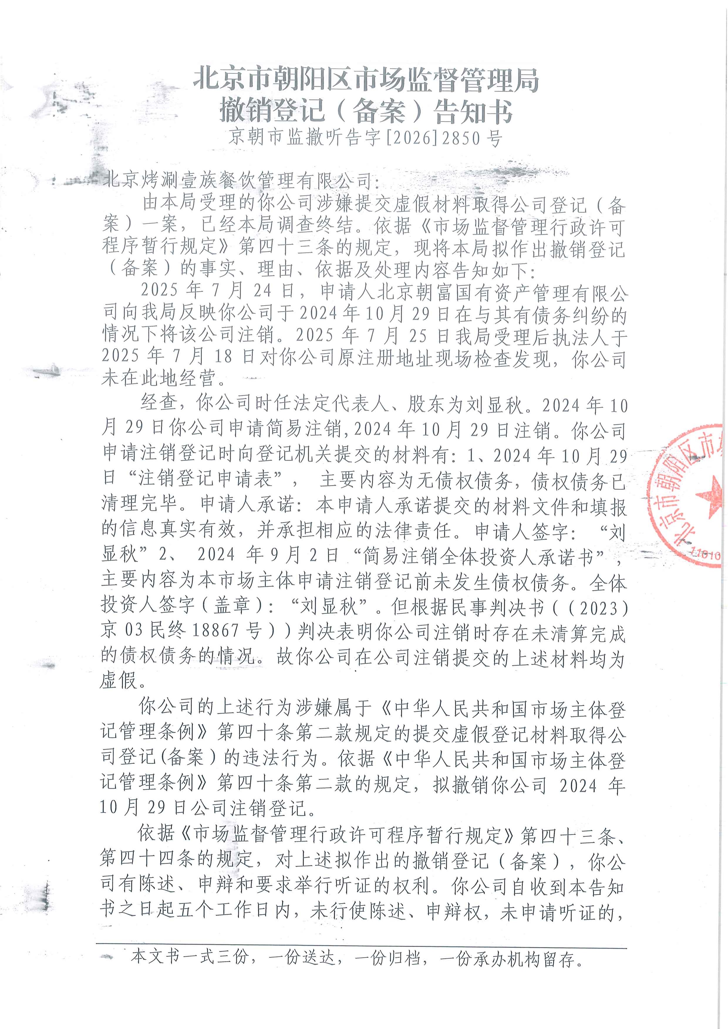 撤销北京烤涮壹族餐饮管理有限公司登记(备案)告知书