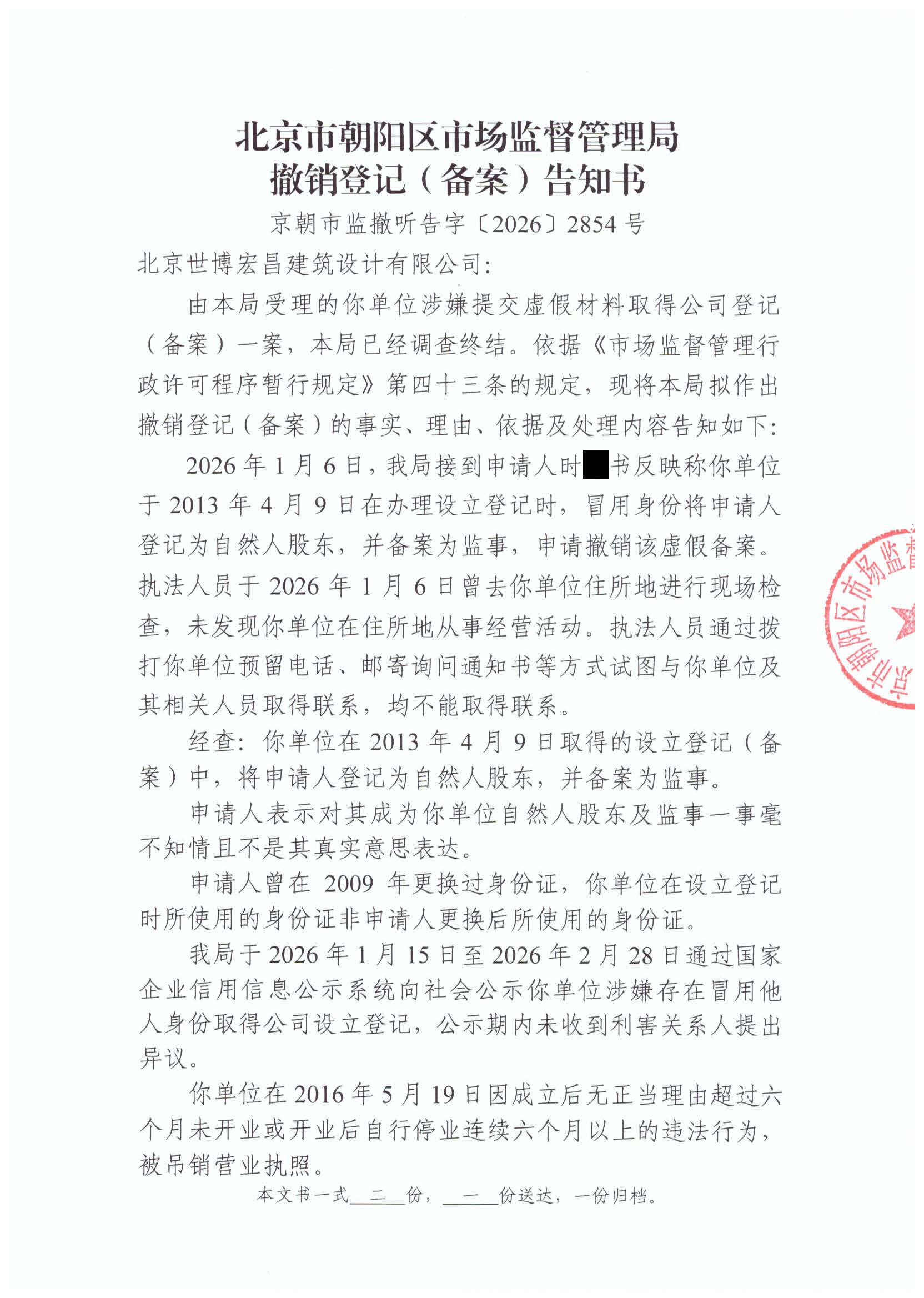 撤销北京世博宏昌建筑设计有限公司登记(备案)告知书