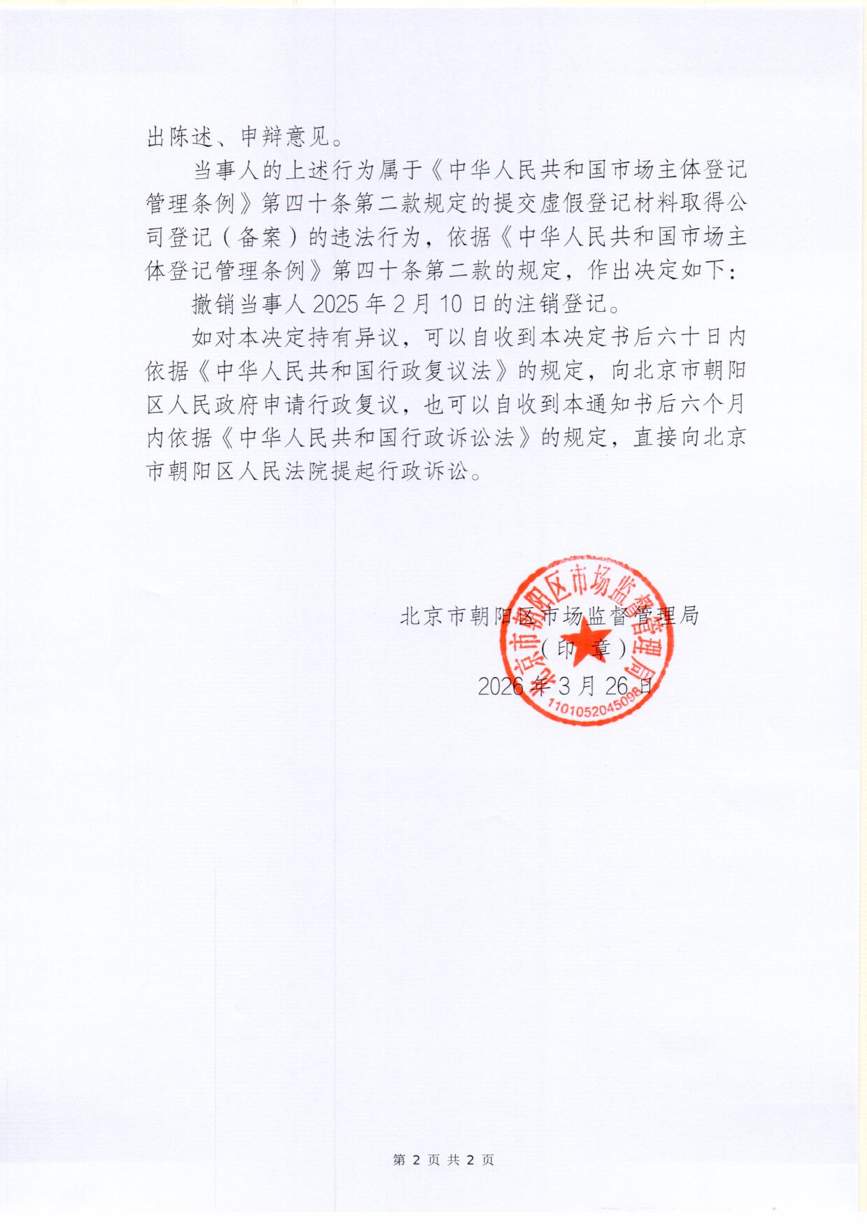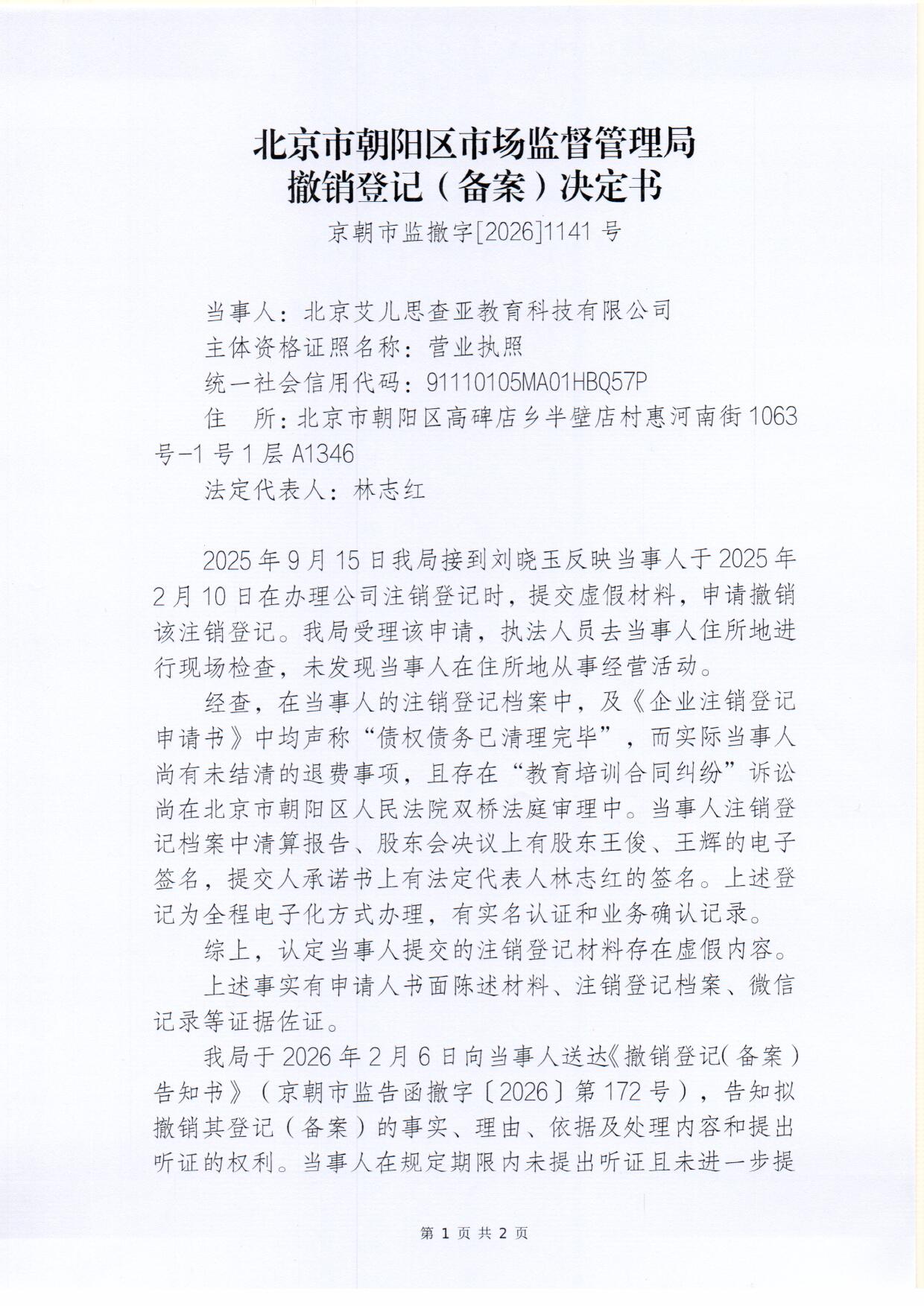 撤销北京艾儿思查亚教育科技有限公司登记(备案)决定书