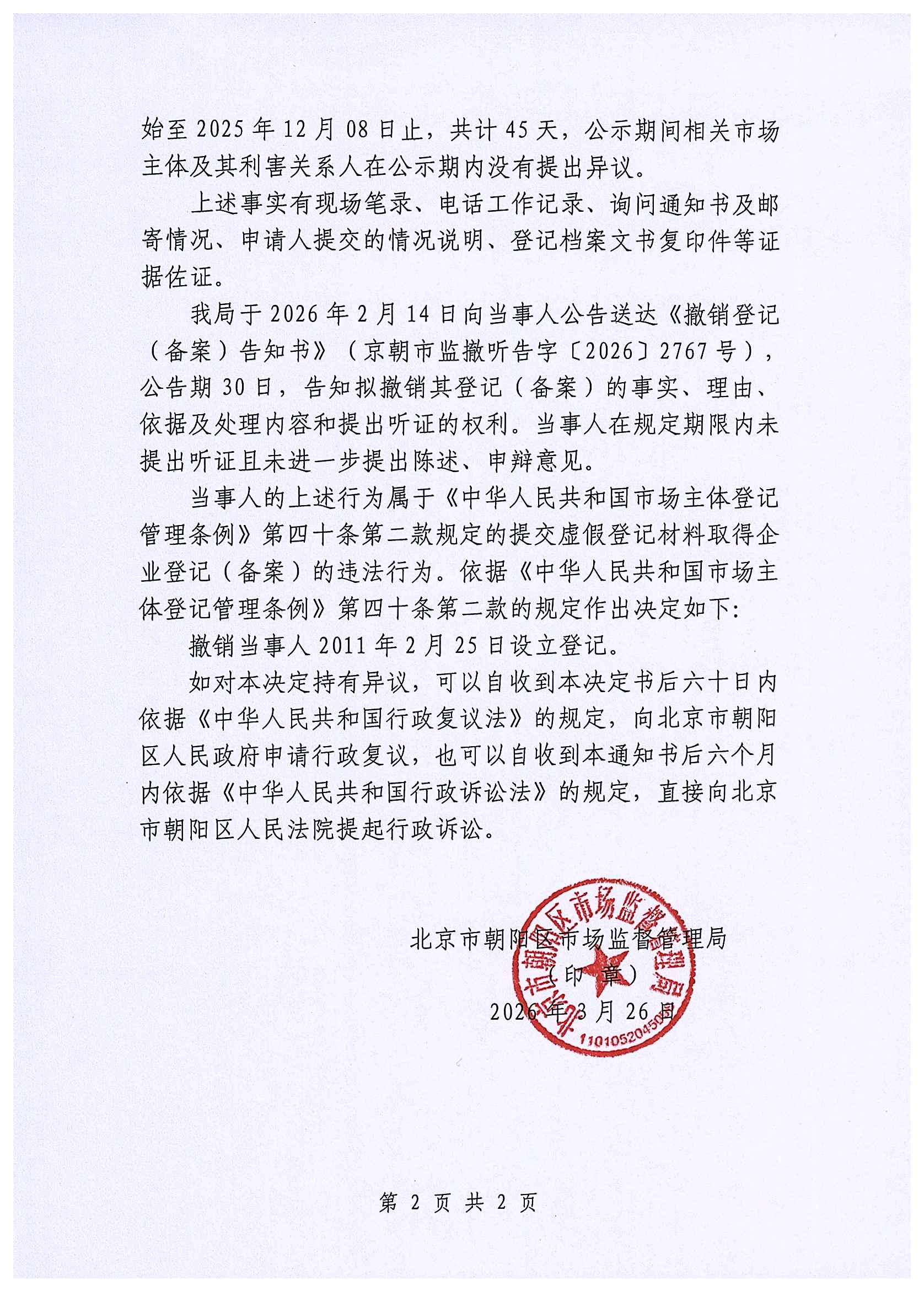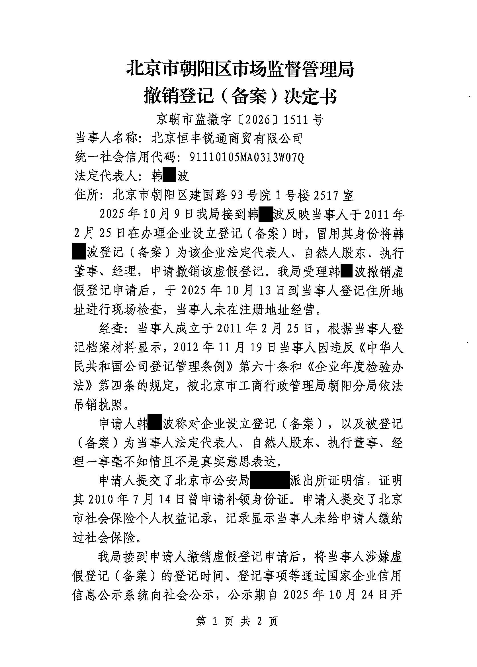 撤销北京恒丰锐通商贸有限公司登记(备案)决定书