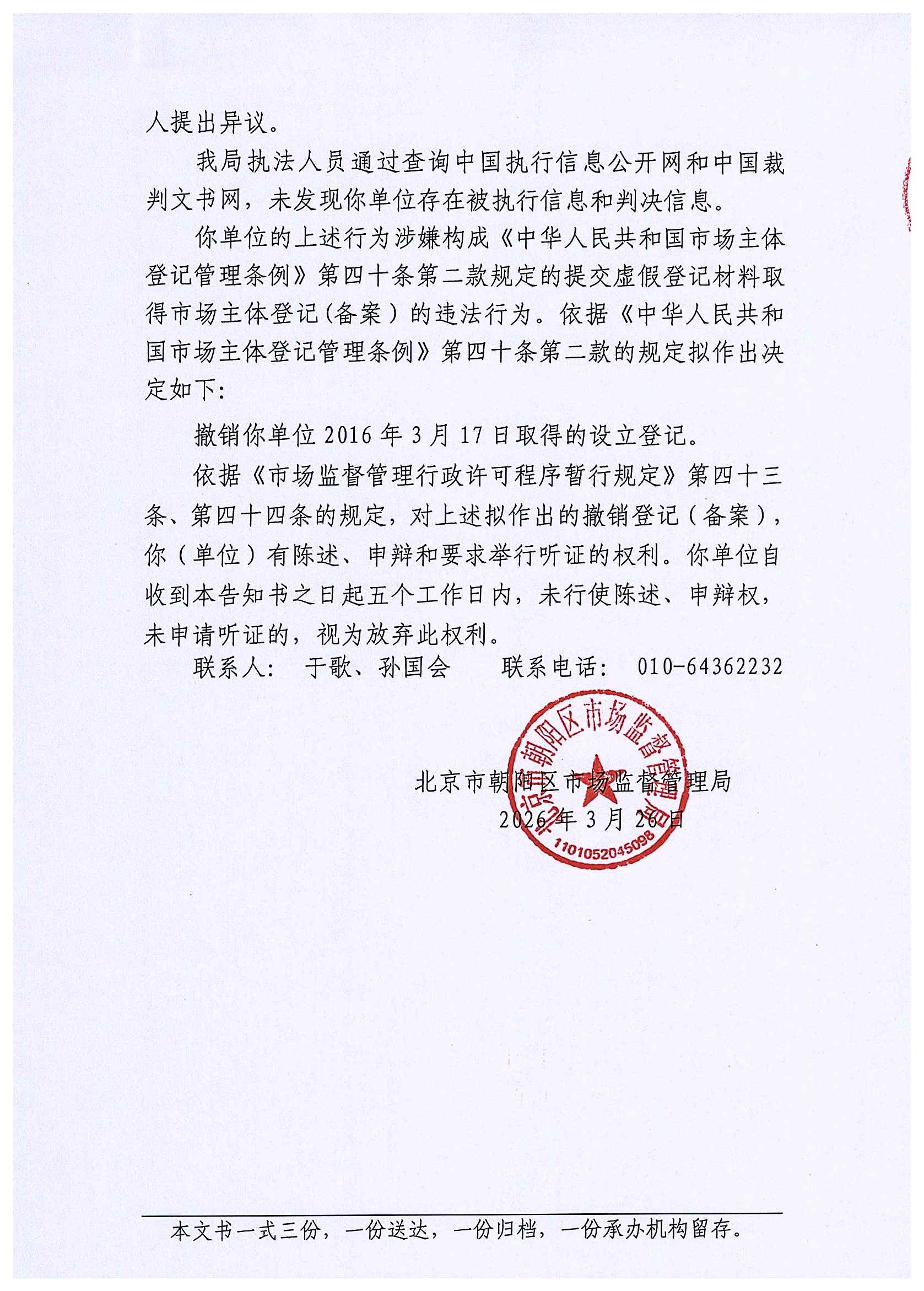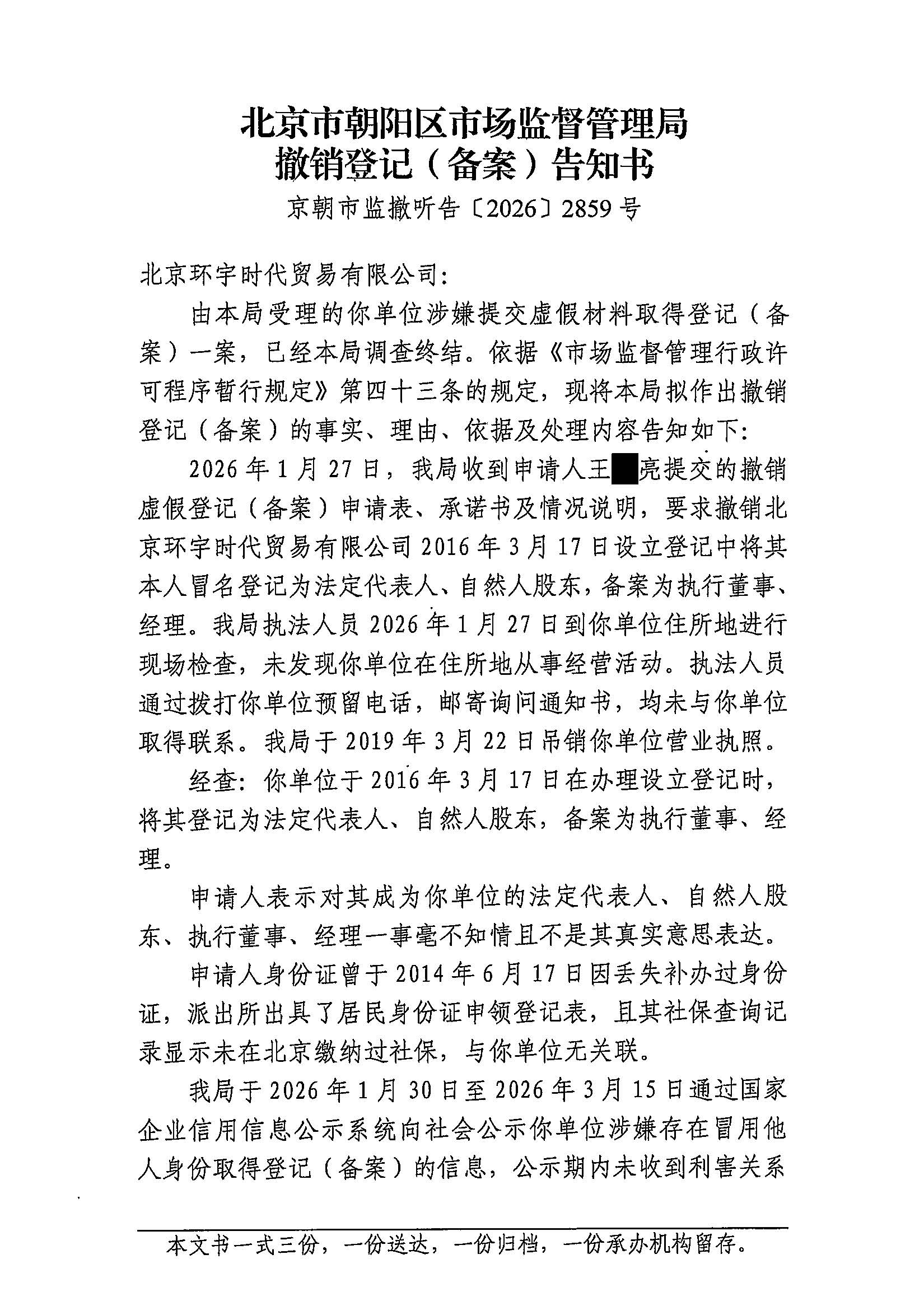 撤销北京环宇时代贸易有限公司登记(备案)告知书