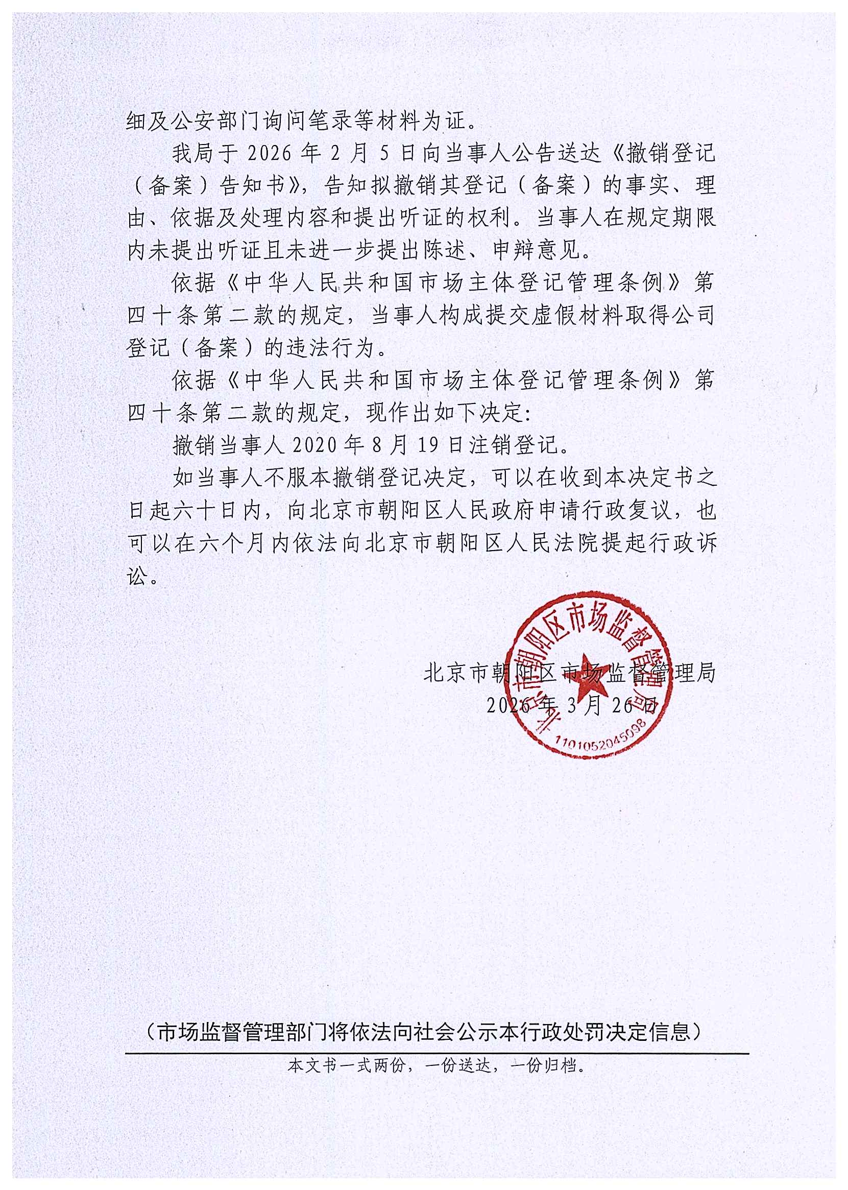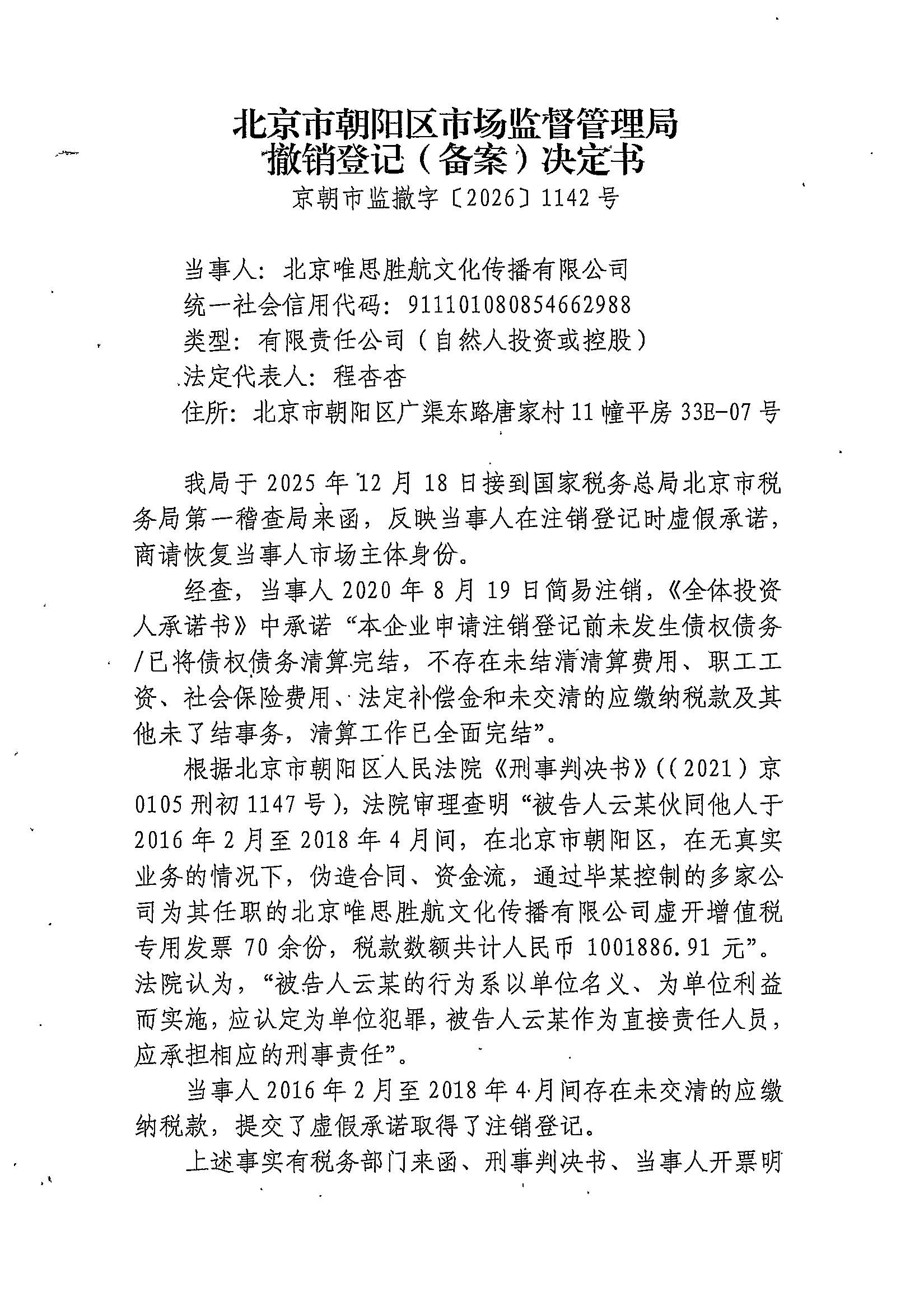 撤销北京唯思胜航文化传播有限公司登记(备案)决定书