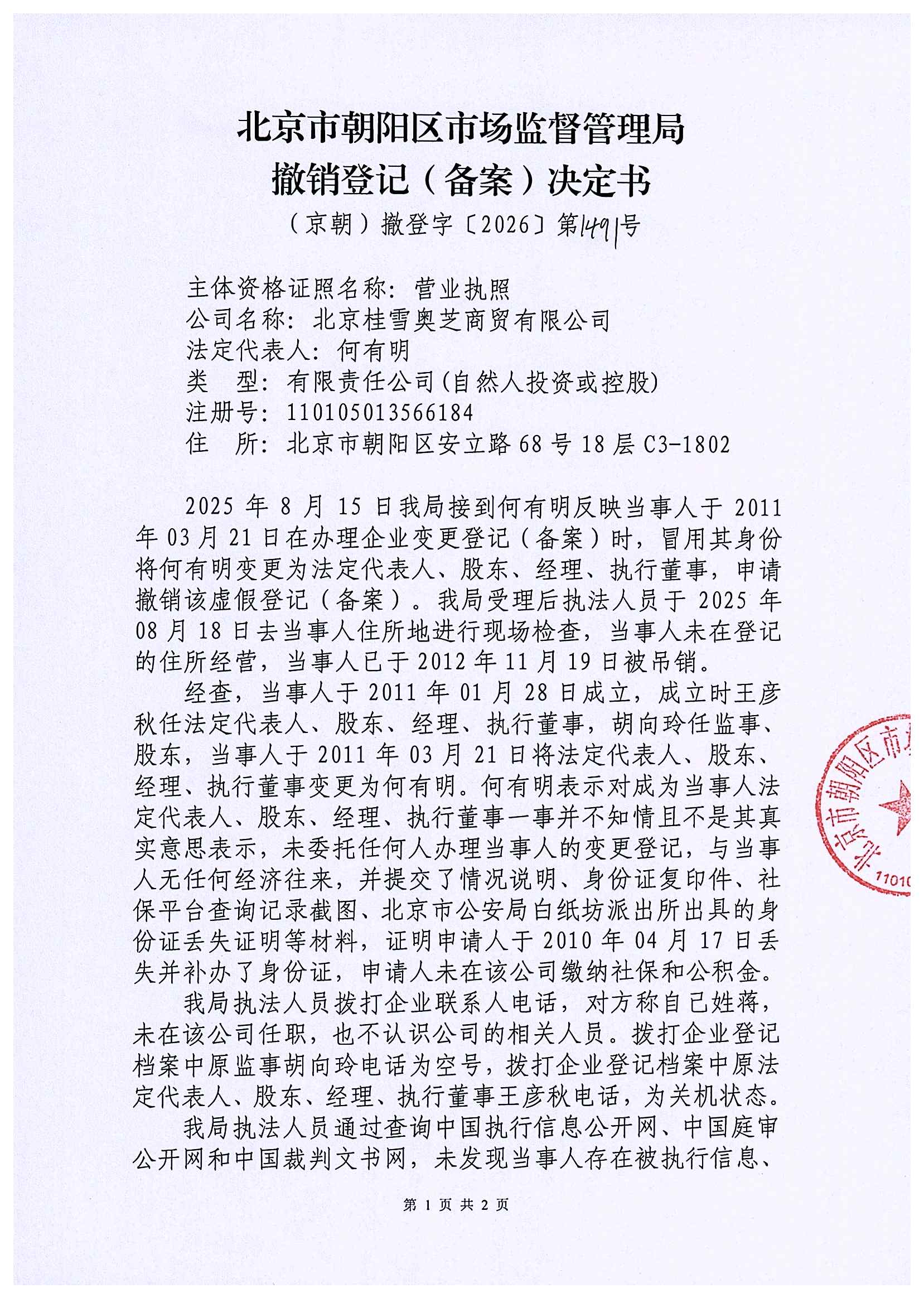 撤销北京桂雪奥芝商贸有限公司登记(备案)决定书