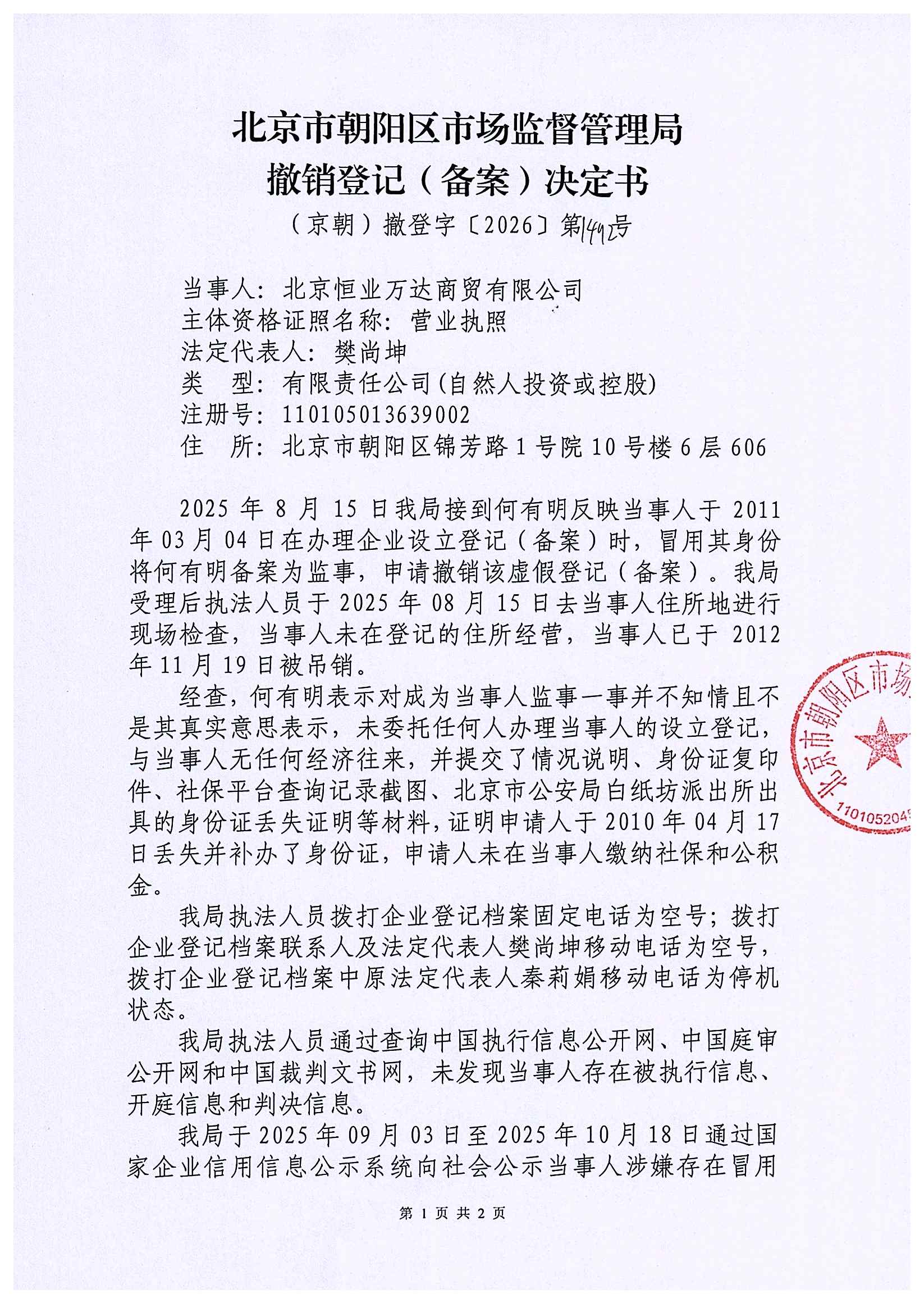 撤销北京恒业万达商贸有限公司登记(备案)决定书