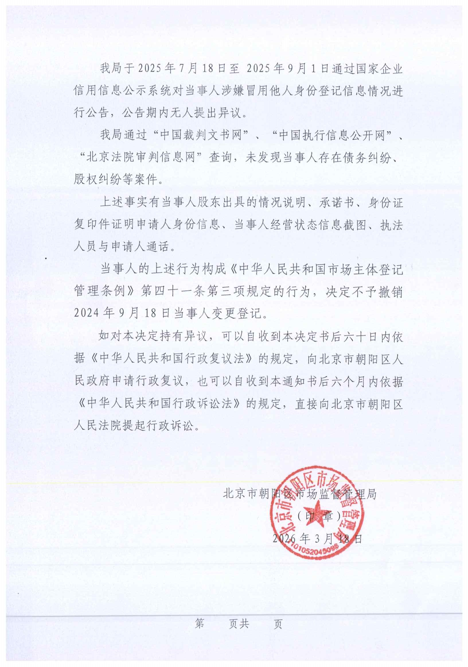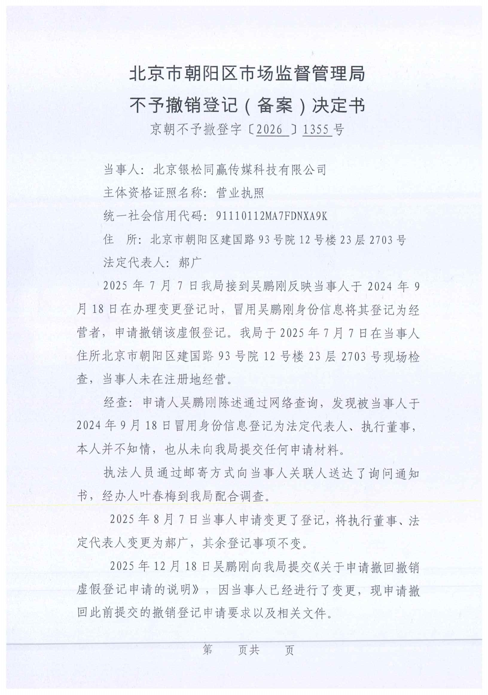 不予撤销北京银松同赢传媒科技有限公司登记(备案)决定书