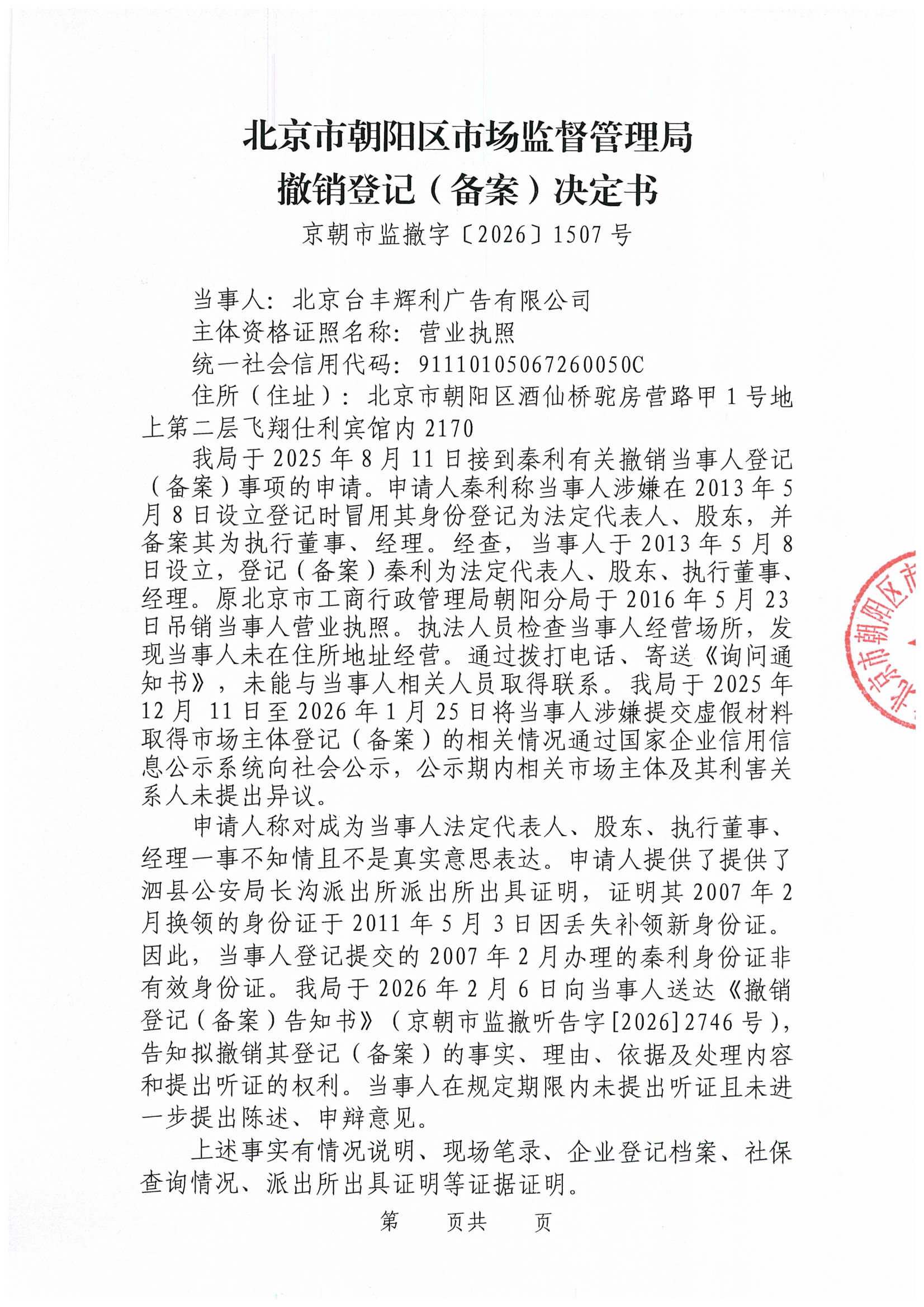 撤销北京台丰辉利广告有限公司登记(备案)决定书