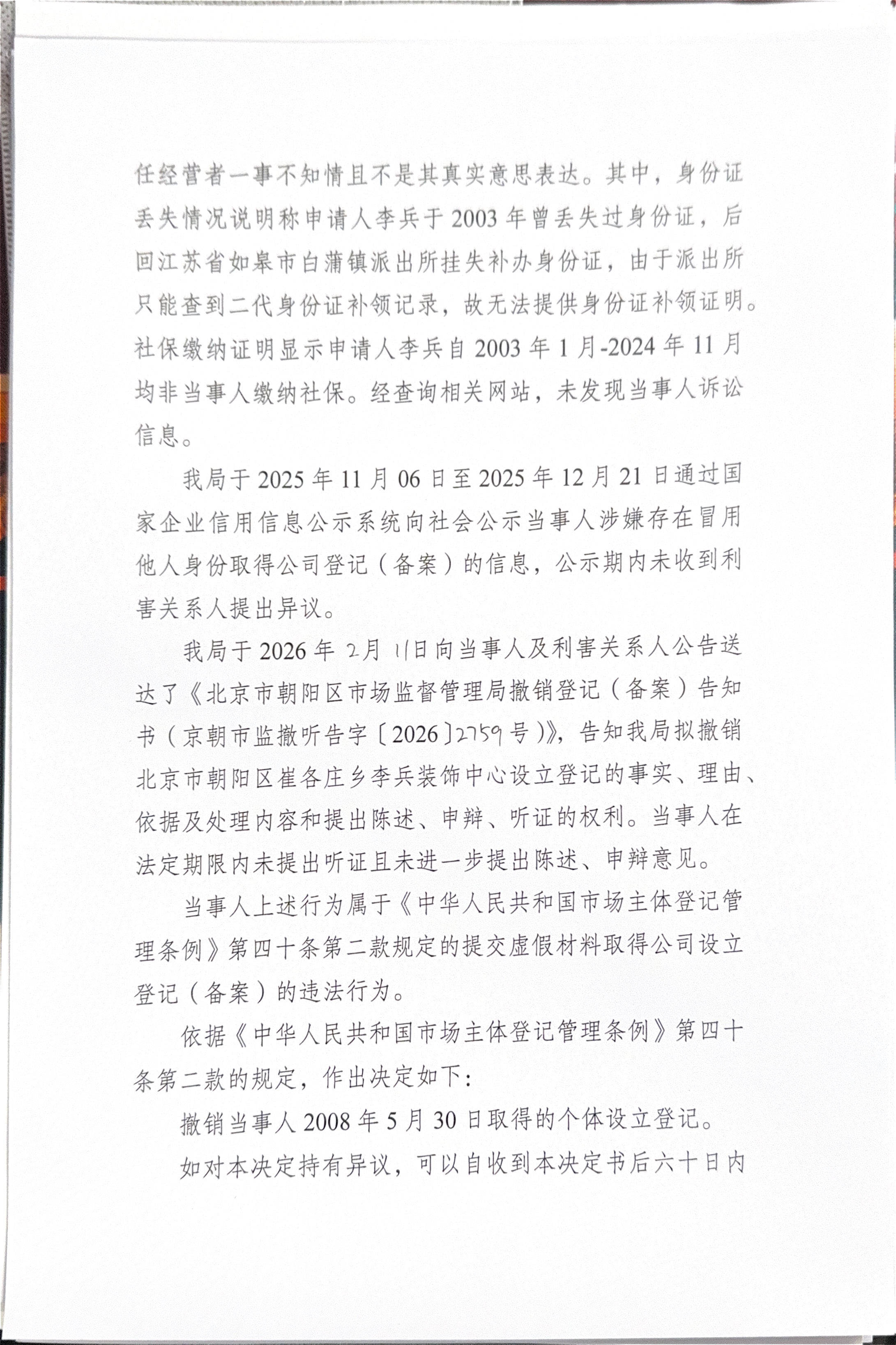 撤销北京市朝阳区崔各庄乡李兵装饰中心登记(备案)决定书