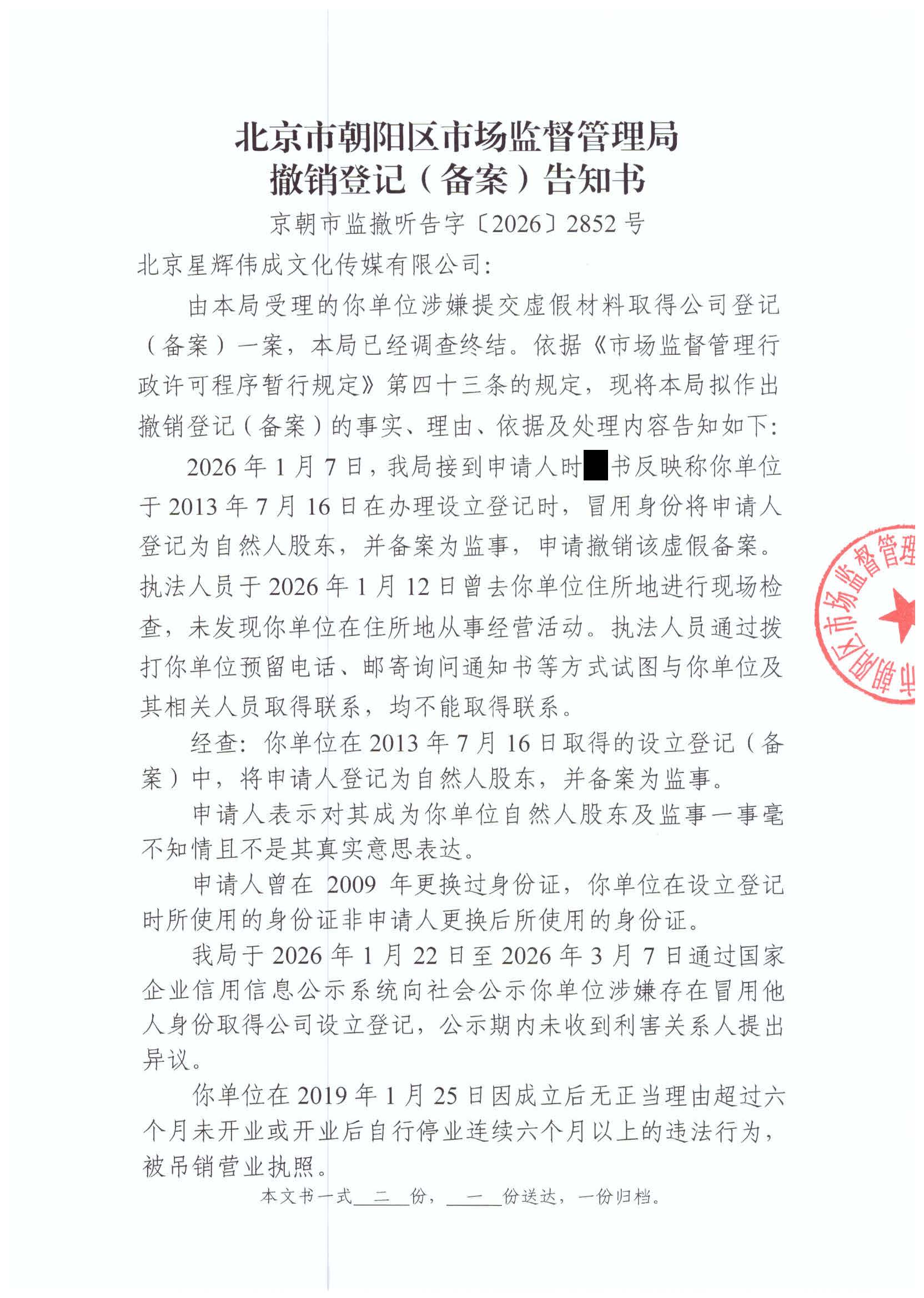 撤销北京星辉伟成文化传媒有限公司登记(备案)告知书