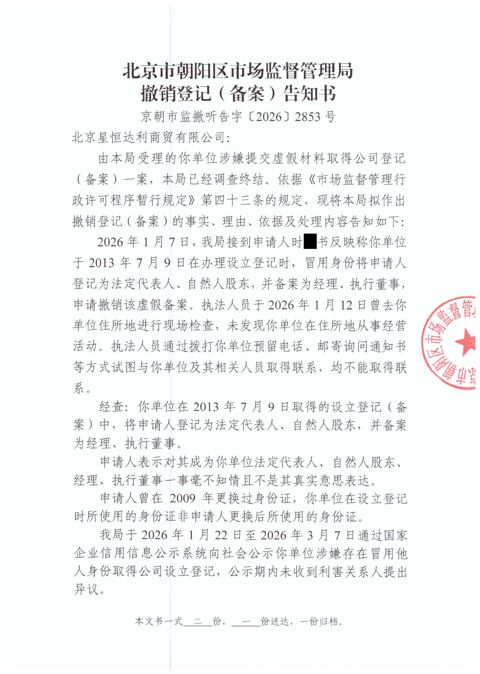 撤销北京星恒达利商贸有限公司登记(备案)告知书