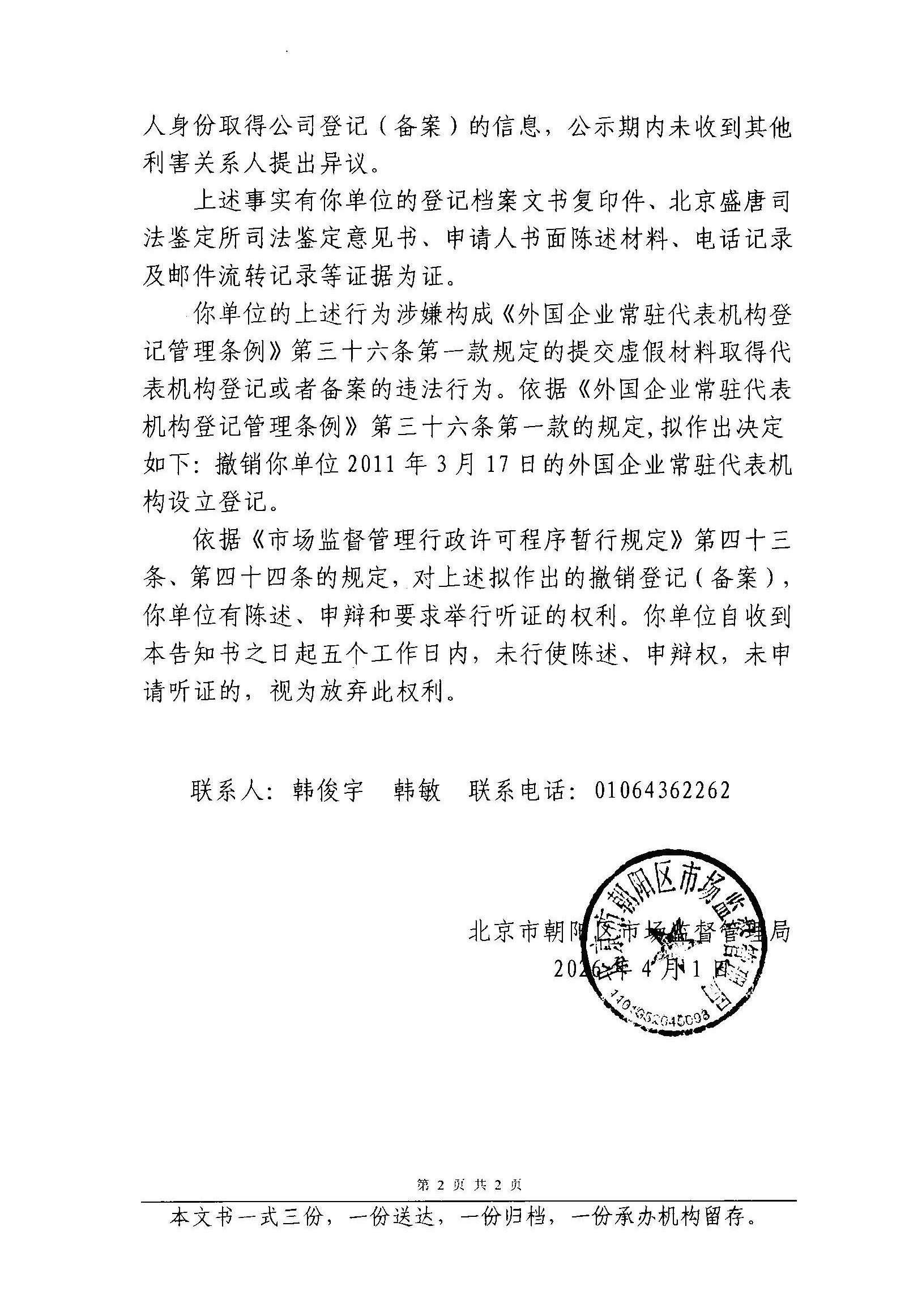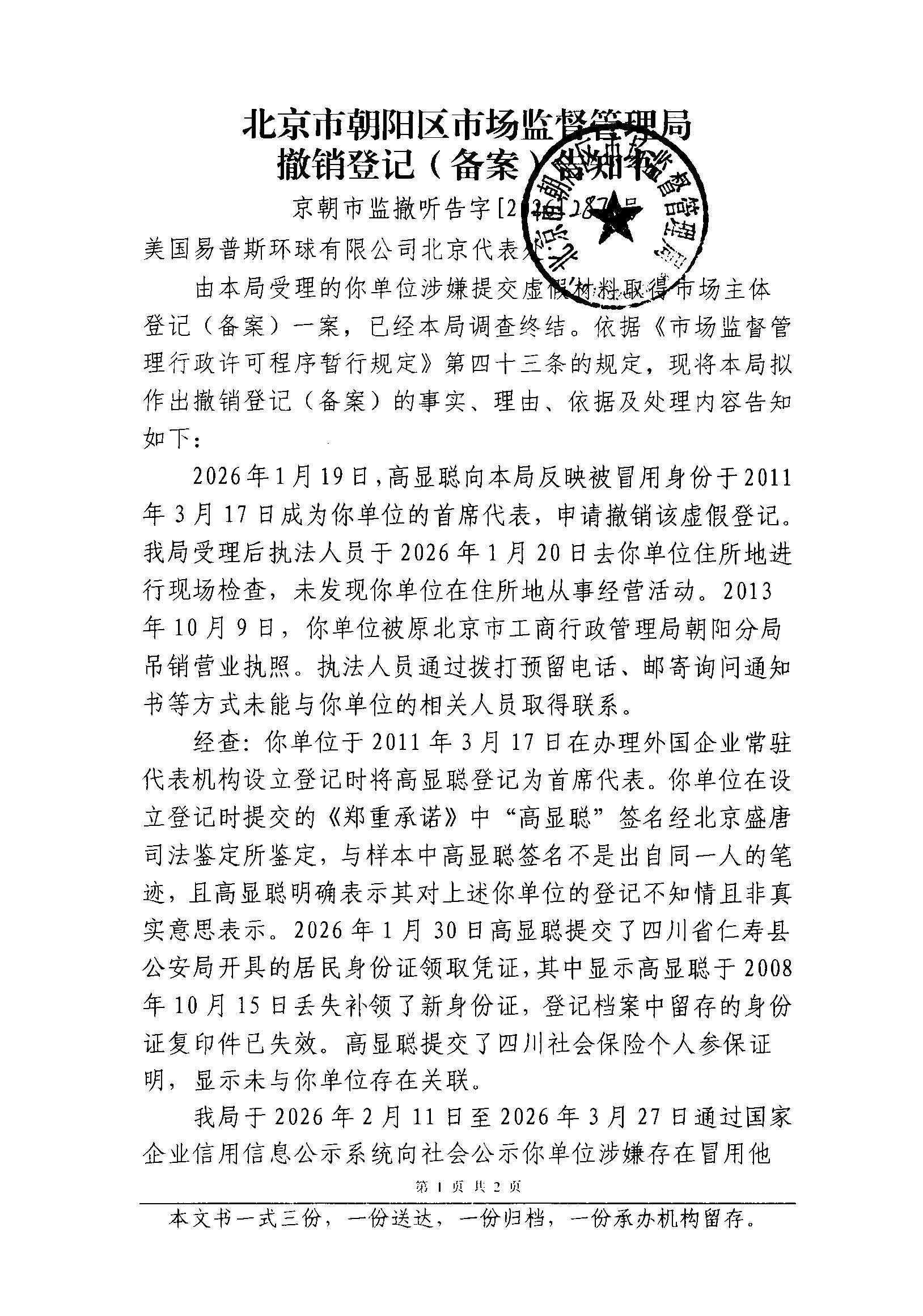 撤销美国易普斯环球有限公司北京代表处登记(备案)告知书