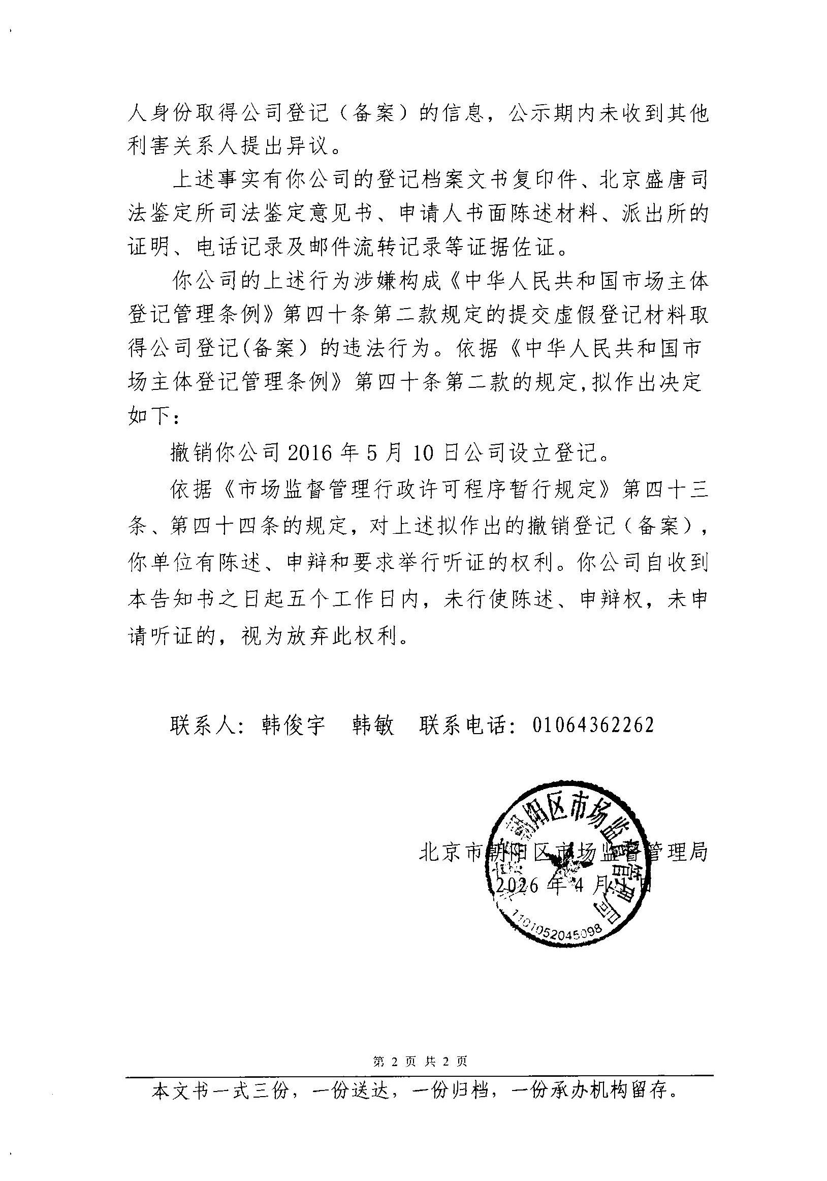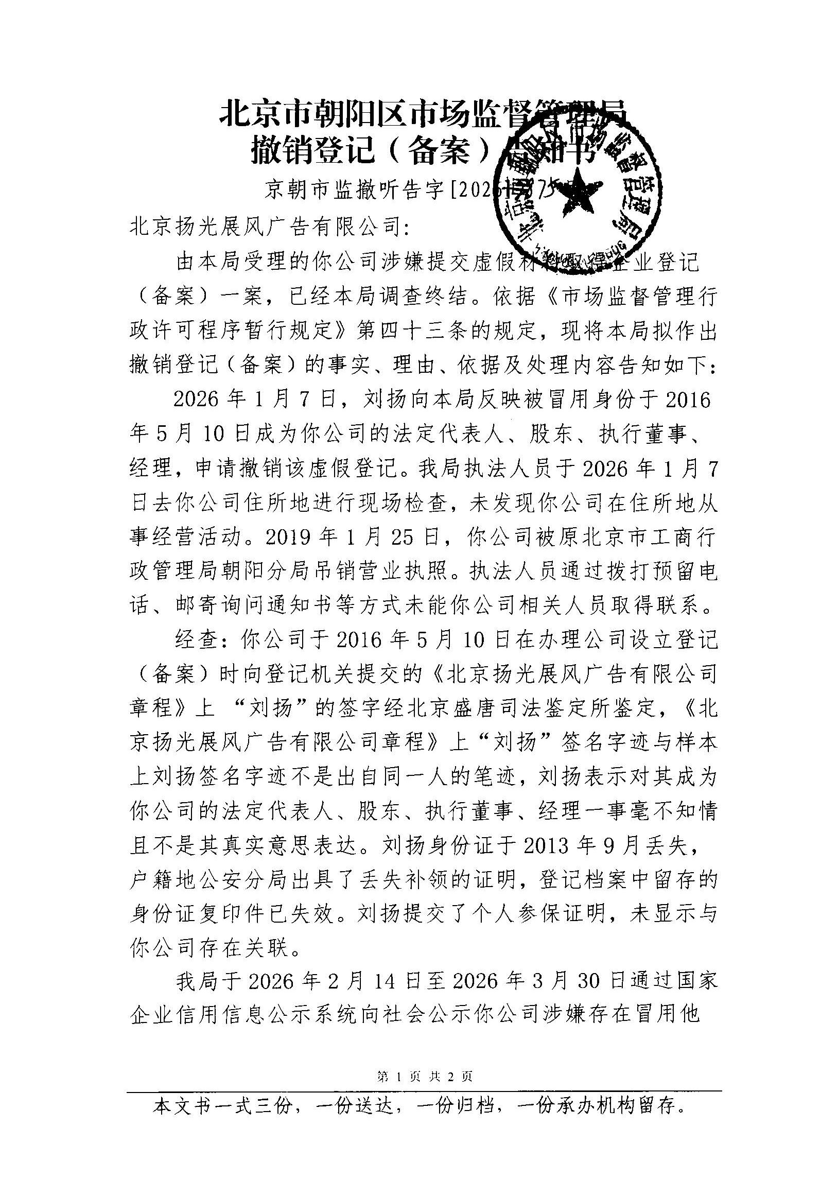 撤销北京扬光展风广告有限公司登记(备案)告知书