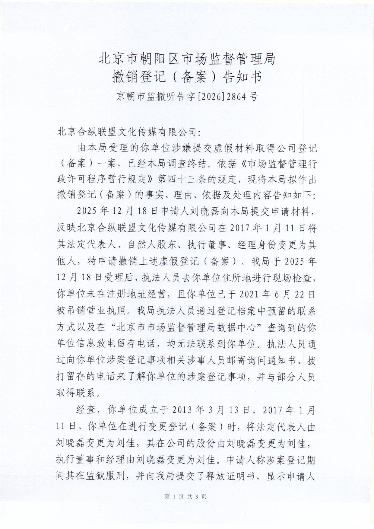 撤销北京合纵联盟文化传媒有限公司登记(备案)告知书