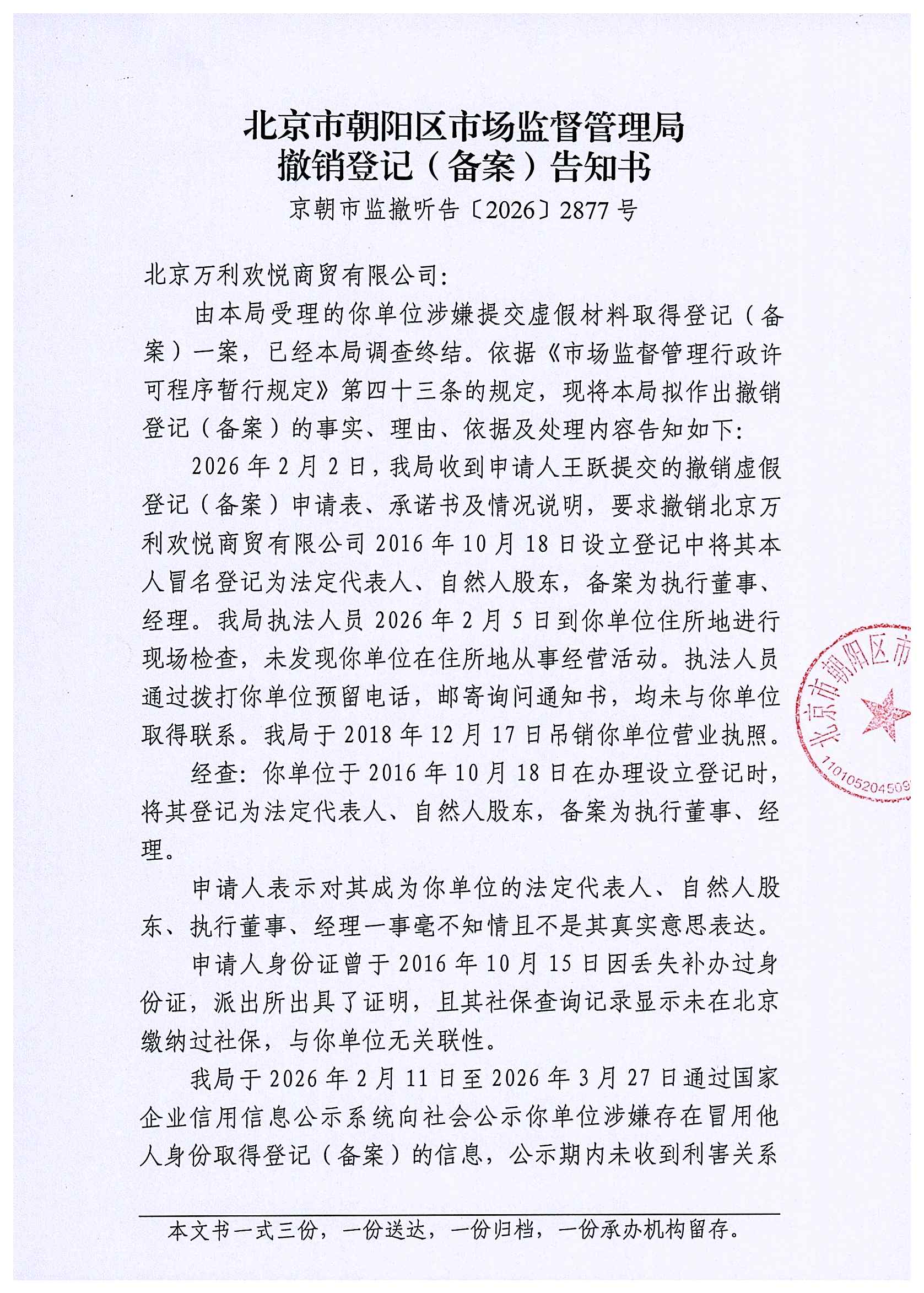 撤销北京万利欢悦商贸有限公司登记(备案)告知书