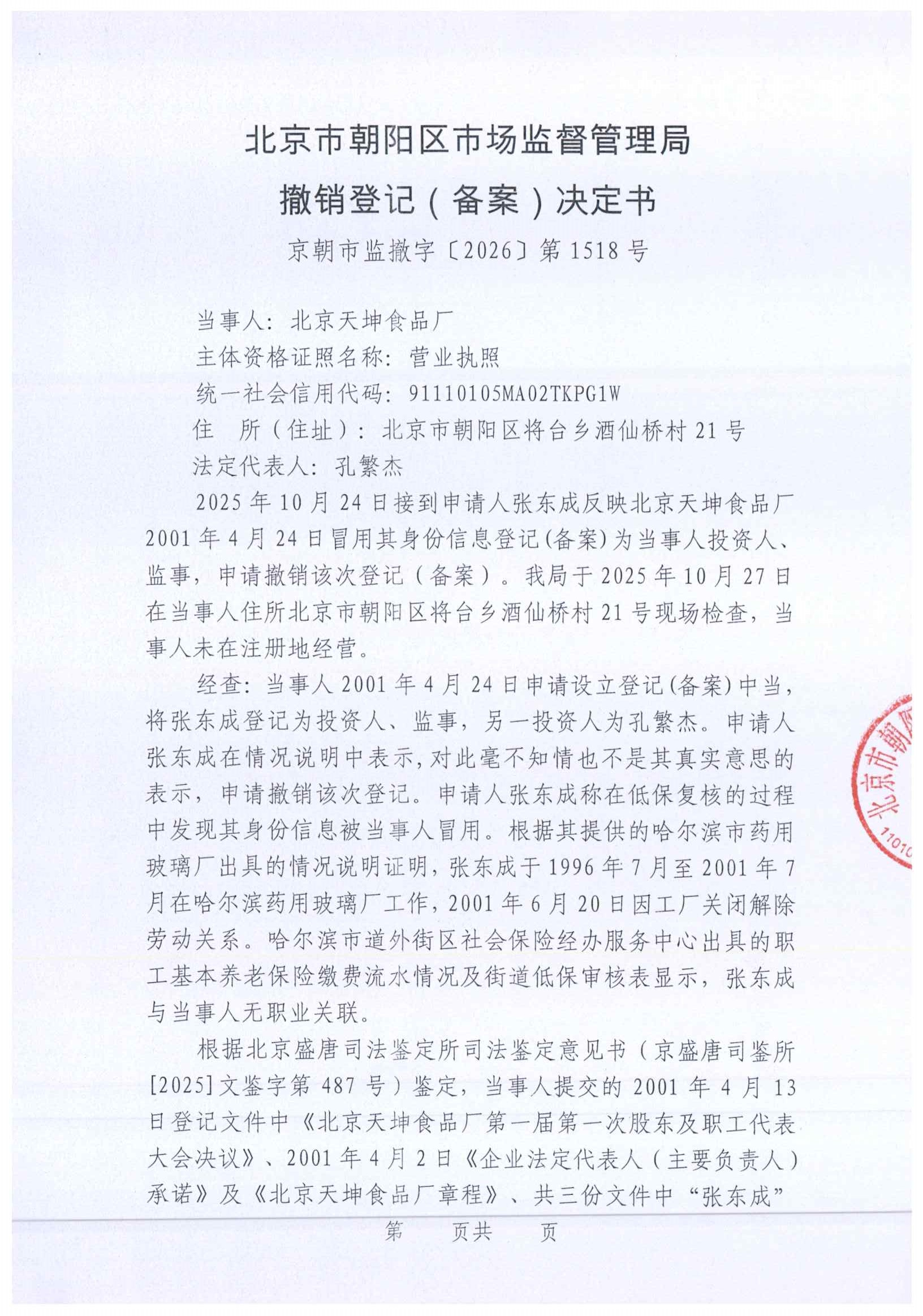 撤销北京天坤食品厂登记(备案)决定书