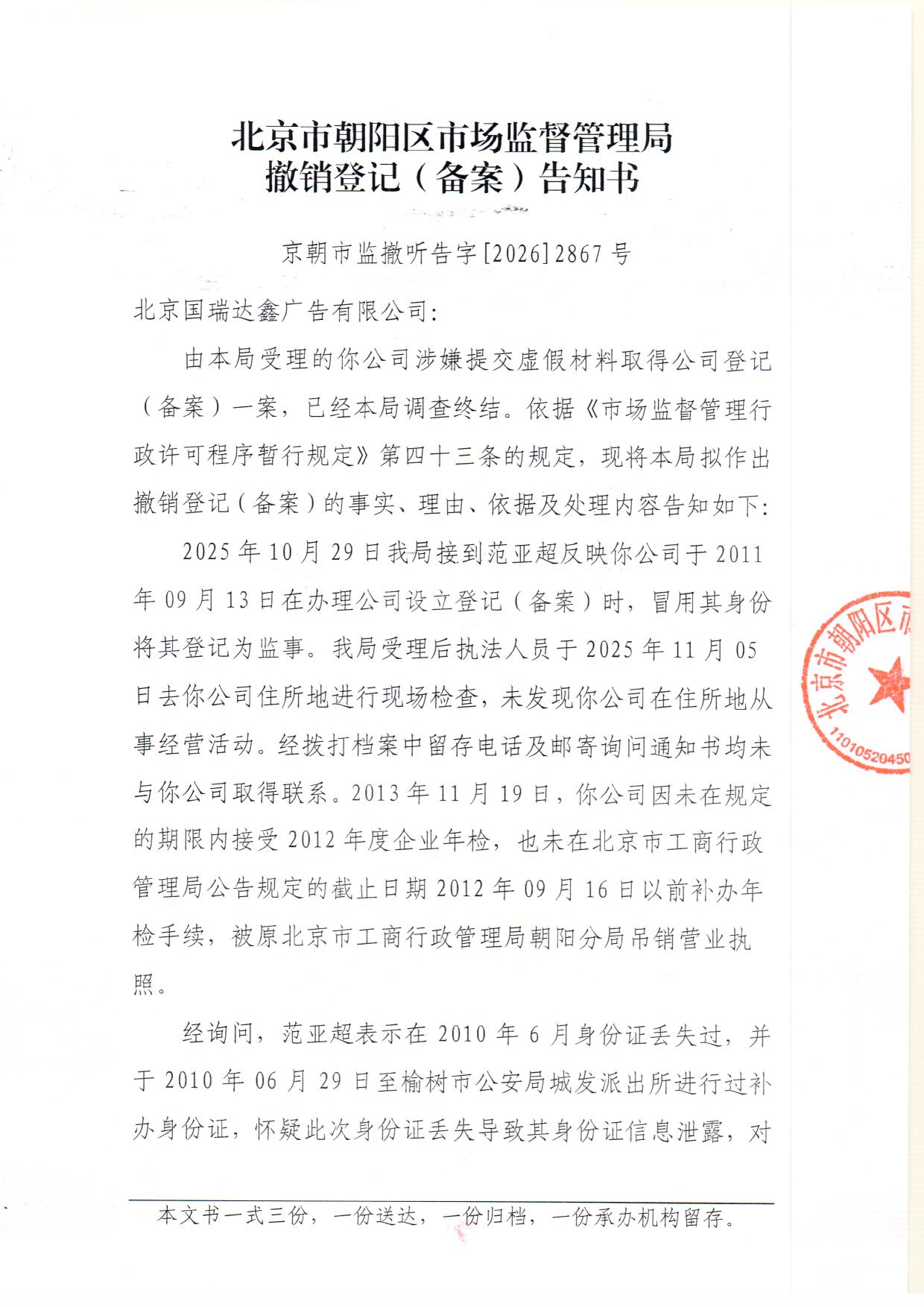 撤销北京国瑞达鑫广告有限公司登记(备案)告知书