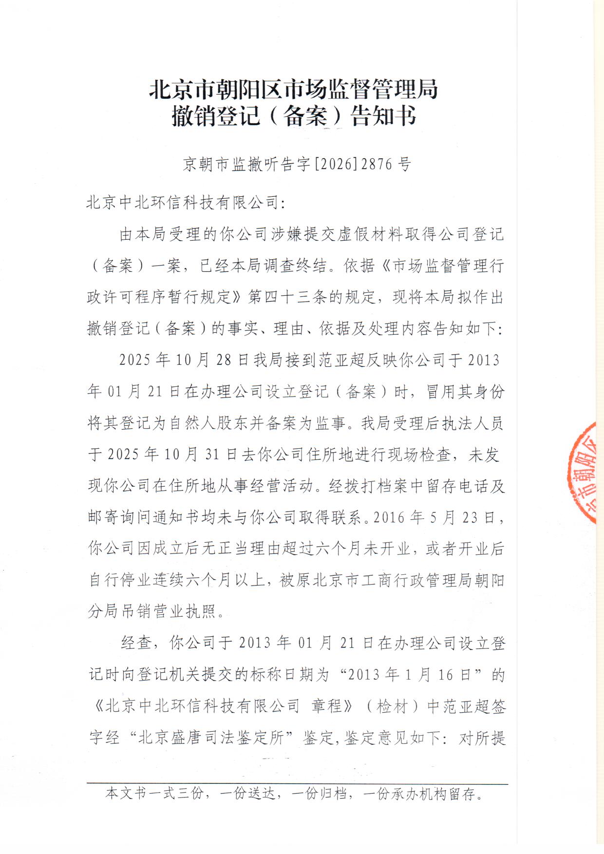 撤销北京中北环信科技有限公司登记(备案)告知书