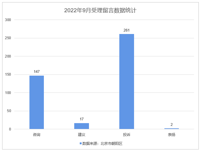 北京市朝阳区政府门户网站2022年9月共收到公众来信427件,其中咨询类信件147件,建议类信件17件,投诉类信件261件,表扬类信件2件,已全部办结。正在办理数0件。
