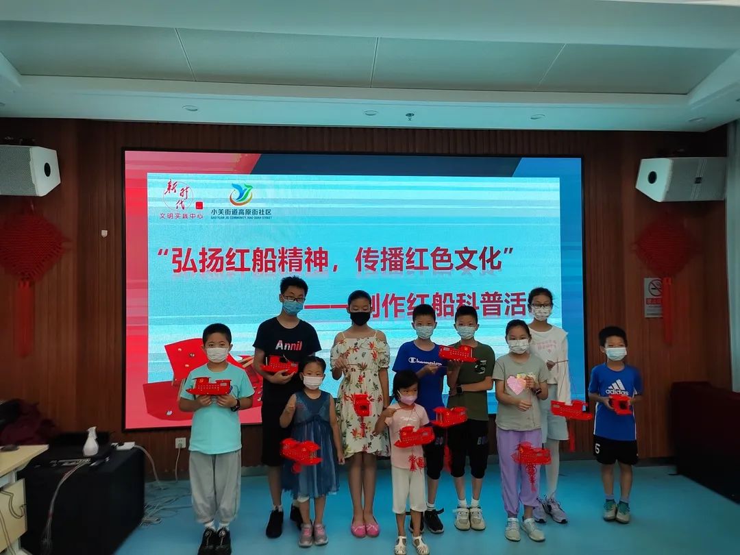 为引导青少年准确理解“红船精神”的丰富内涵,高原街社区以“弘扬红船精神,传播红色文化”为主题开展了手工制作红船活动,以红船为载体,通过“学红船、做红船”来认识、感受、传播“红船精神”。