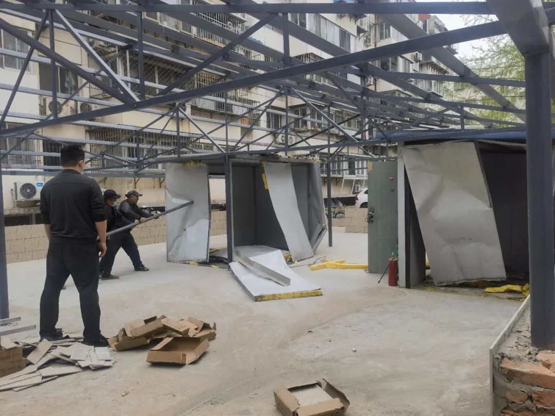 为了提升小区环境质量,2023年望京街道办事处对金兴路一号院进行小区改造升级,产权单位对该院一号楼车棚也一并进行了更新改建。该处院落为单位职工家属院,一号楼下车棚为单位为方便职工存放非机动车建设,个别居民为了存放家庭杂物,擅自在车棚内用彩钢板搭建了5处违建房屋,不仅挤占了公共空间,也造成了消防安全隐患,由于车棚内存放车辆和充电装置,一旦引发火灾,后果不堪设想。随着小区的改造升级,这些隐藏在车棚内的违法建设也被暴露出来。为此,由该院产权单位牵头,对车棚内的违法建设进行统一清理拆除。