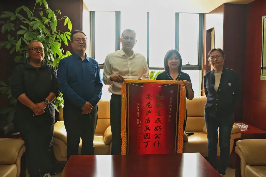 4月19日上午,人大附中朝阳实验学校望京校区代表来到望京街道办事处,将一面写有“助教惠民好公仆 爱花护苗真园丁”的锦旗交到街道办事处主任张健、街道办事处副主任刘刚手中,并对此前街道联系相关部门,消除校园周边虫害、清除垃圾等一系列行动表达感谢。