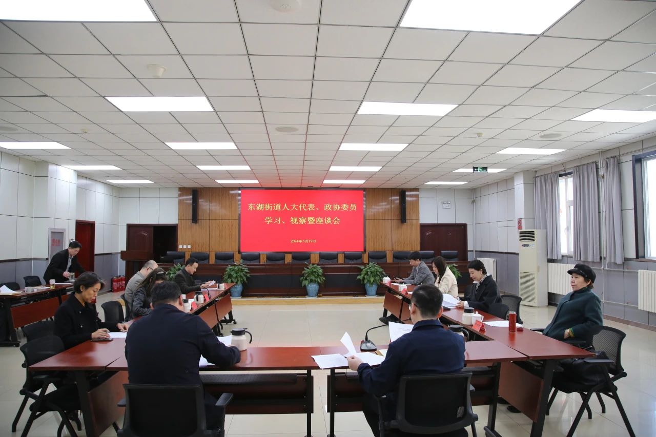 3月19日,东湖街道召开人大代表、政协委员学习、视察暨座谈会。东湖街道办事处主任、政协委员工作站站长武宁,街道工委副书记、人大工委副主任王国臣,人大代表田树林、王英明、高维嘉、韩丽敏,政协委员玉红、黄九梅、吴文多、王强参加。