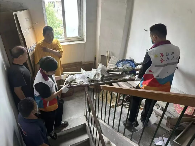 今年7月初,小区“楼道守护”行动正式启动。社区广泛动员组织居民、物业、社工依次对4栋楼的楼道进行清理,包括清理堆物堆料、打扫楼道卫生、擦拭扶手、清理窗户污渍等。居民积极响应,物业全力配合,大家备好清运车、清理工具,一起动手进行楼道“美颜大战”,为后续安装窗纱创造整洁环境。