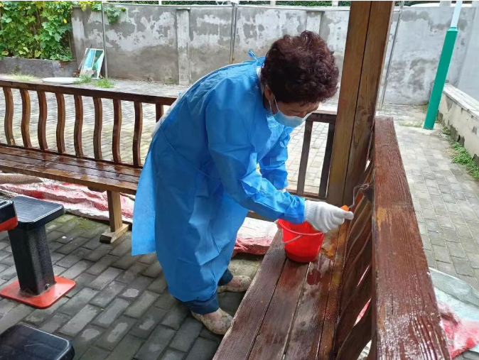小区“凉亭守护”行动紧随其后火热展开,这4座凉亭建成约10年,因长期日晒雨淋和年久失修,早已出现掉漆、干裂、漏雨等问题,渐渐成了居民“不愿靠近的角落”。为了让居民休闲纳凉的重要场所焕发全新光彩,社区积极动员居民、物业、外卖小哥等参与动手粉刷凉亭,同时贴心准备了手套、口罩、罩衣等防护用品。现场,大家分工协作、干劲十足,仔细为凉亭每一处角落刷上防腐防潮油漆。粉刷结束后,维修工人又对破损顶部进行修补,进一步延长凉亭使用寿命。