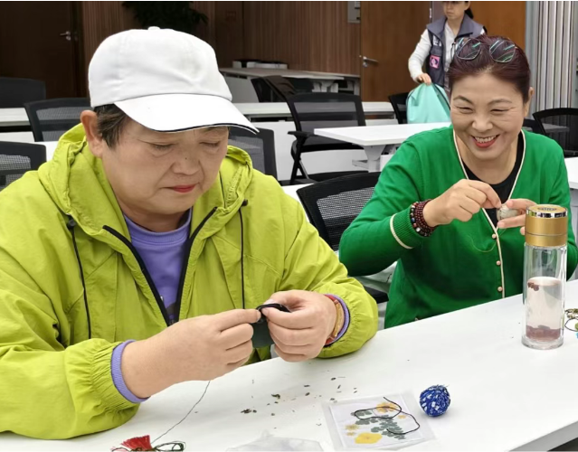 除了干花相框,活动现场还增设了布艺柿子挂件的制作环节。居民们选取布料,填充艾草,一针一线缝制出饱满可爱的“柿子”,寓意“事事如意”。艾草的清香随风飘散,为秋日增添了一抹安宁与温馨,居民们在亲手制作中感受到传统手工艺的乐趣与美好寓意。