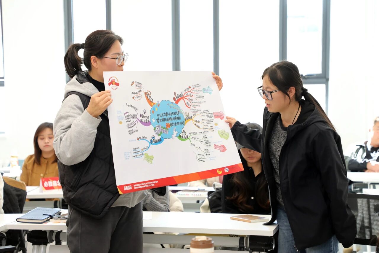 活动以“思维导图”为核心学习工具,分四个环节层层递进。在“烽火家书”环节,各组随机抽取抗战时期珍贵家书,以“家国情怀”为中心,用思维导图梳理“历史背景”“精神内核”“当代价值”等分支。“导图共学”阶段,通过观看现场视频、对照全景思维导图研读讲话原文,团干部们系统把握了讲话的核心内容与精神实质。“小组共创”环节以讲话原文为依据、全景思维导图为框架,从“抗战精神的时代价值”到“青年担当的实践路径”。最后的“青春路标”环节,各组依次展示围绕“铭记历史、缅怀先烈、珍爱和平、开创未来”制定的个人行动计划,展现了新时代团干部的素养、理论功底与实干担当。