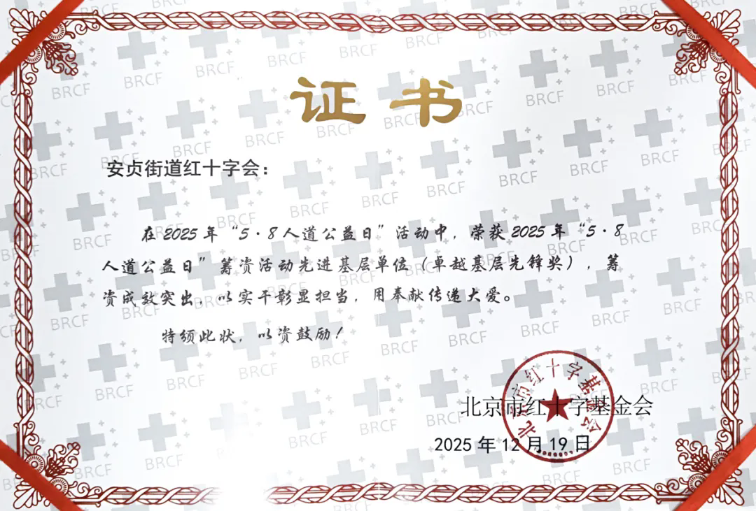 近日,安贞街道红十字会因在北京市红十字基金会“5·8人道公益日”活动中组织动员有力、筹资成效显著,荣获北京市红十字基金会2025年“5·8人道公益日”筹资活动先进基层单位(卓越基层先锋奖),为地区公益事业发展再添亮色。