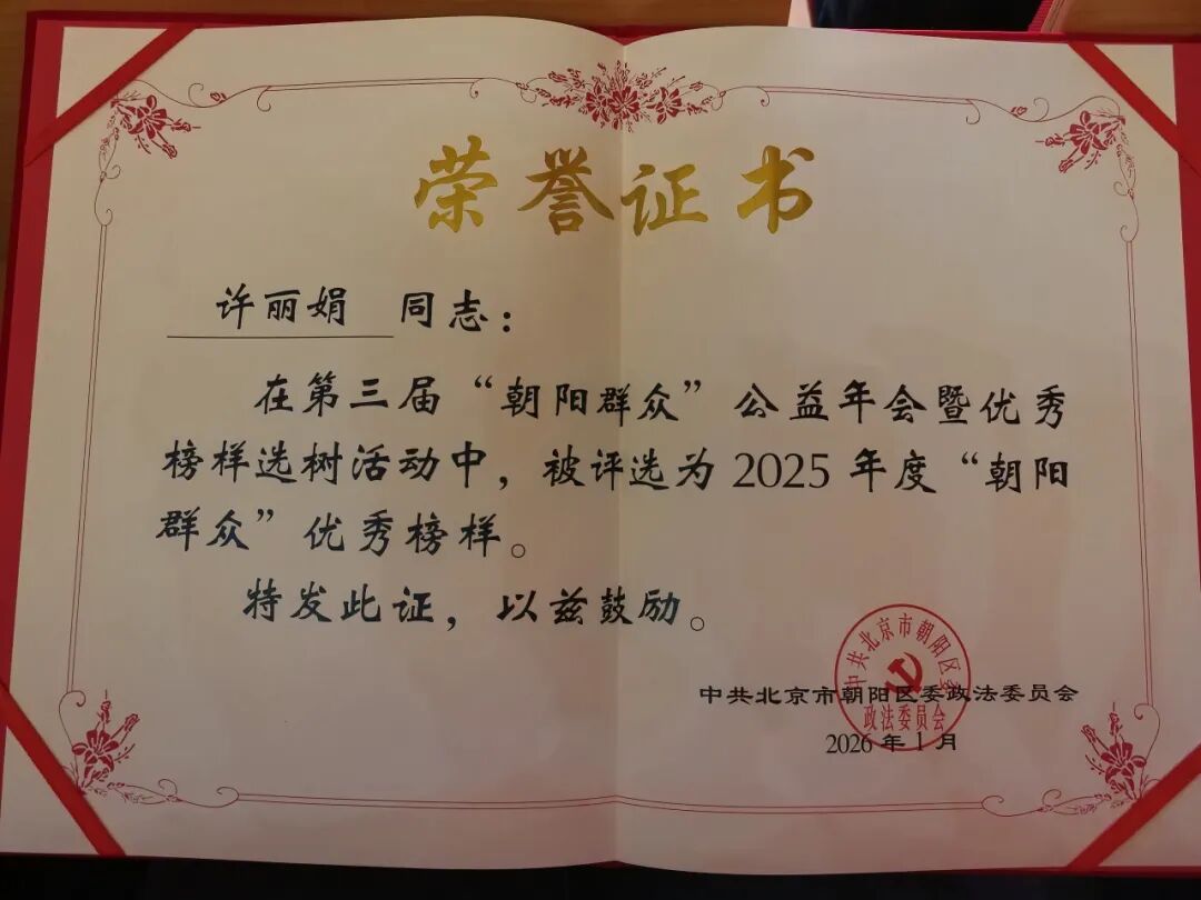 多年来,许丽娟先后获评三间房乡优秀志愿者、优秀党员、优秀社区榜样、优秀社会组织先进个人以及三间房乡“360”全景党建模式“3e通之星”等多项荣誉。每一份荣誉背后,都是她扎根基层、真心付出的生动写照。